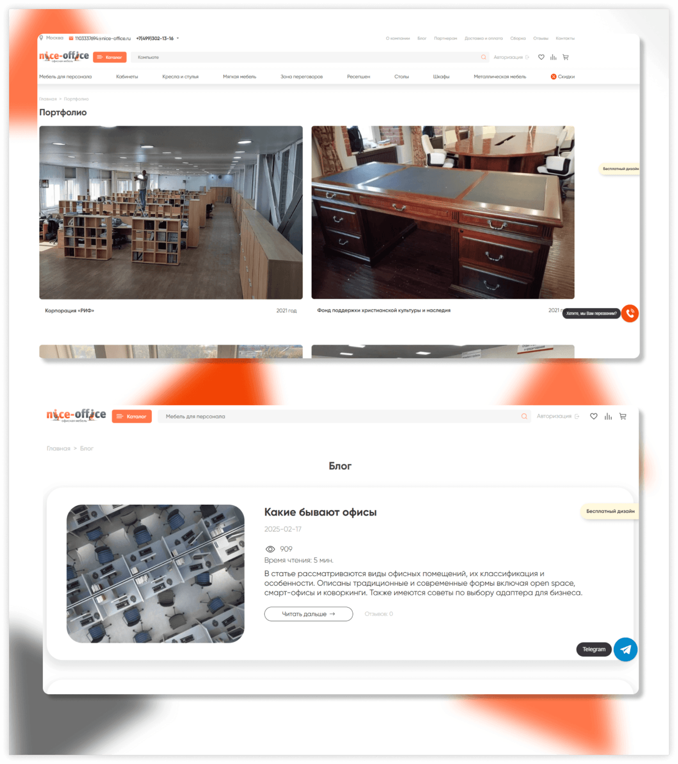 - Блог: Наполнили раздел статьями, полезными для целевой аудитории ("Как выбрать кресло руководителя", "Тренды в оформлении переговорных комнат"), что повышает экспертный статус и органический трафик.