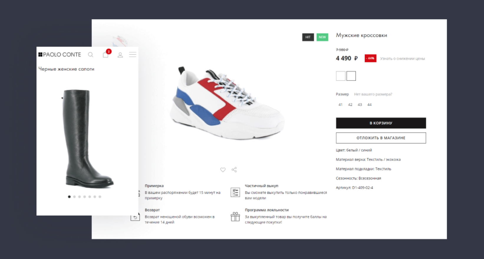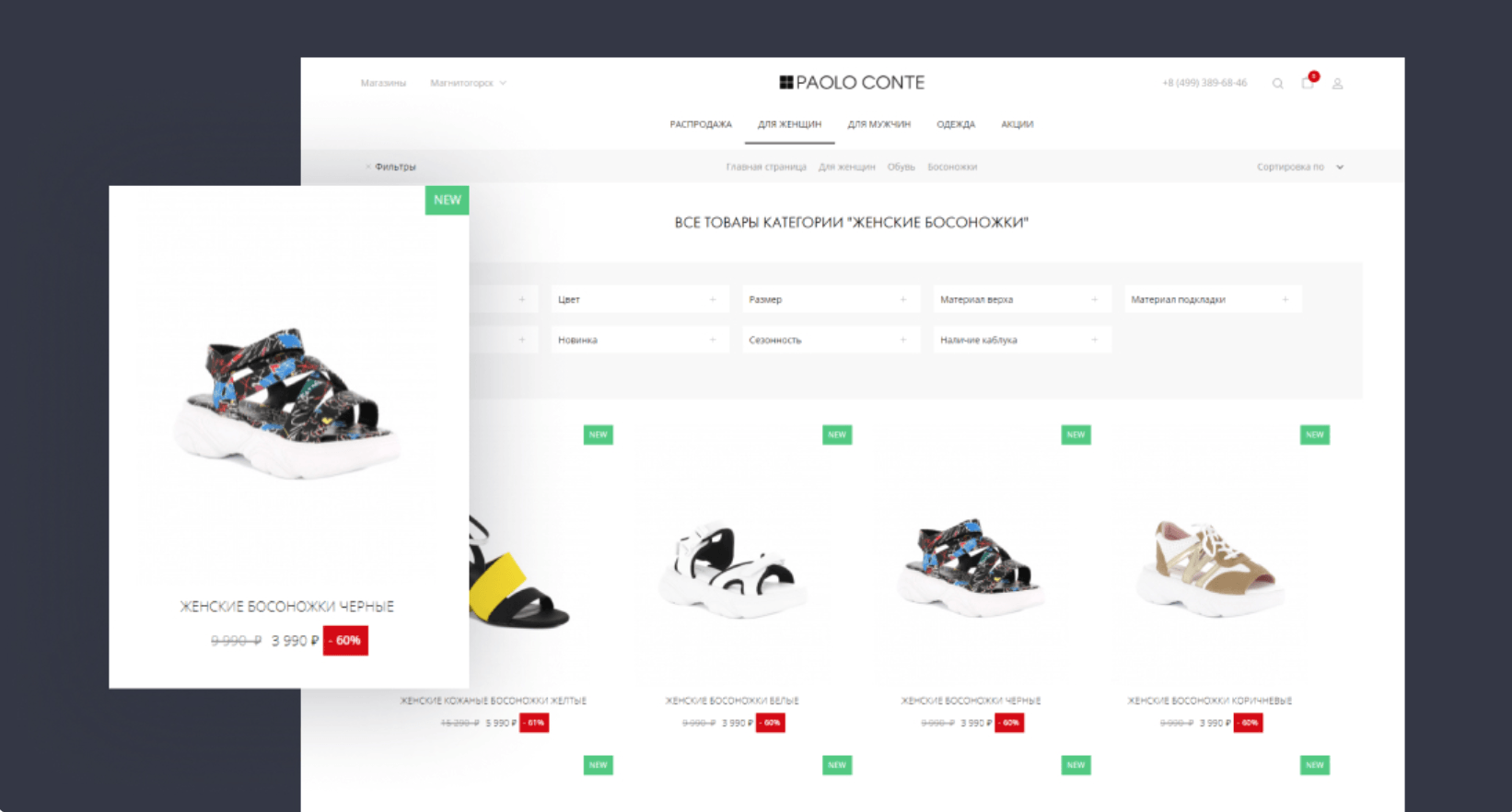 Перед командой студии «Факт» была поставлена ответственная задача – полная реконструкция интернет-магазина производителя обуви и аксессуаров Paolo Conte. Требовалось разработать новый сайт, применив современные технические возможности, повысить продажи, при этом сохранить преемственность фирменного стиля, который отражает высокий статус компании. Задачи: 1. Увеличить конверсию, обеспечить стабильный рост продаж через интернет-магазин. 2. Отразить сервисный подход полезными подсказками, прозрачной навигацией, отзывчивым интерфейсом. 3. Повысить узнаваемость и лояльность к бренду.