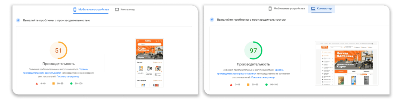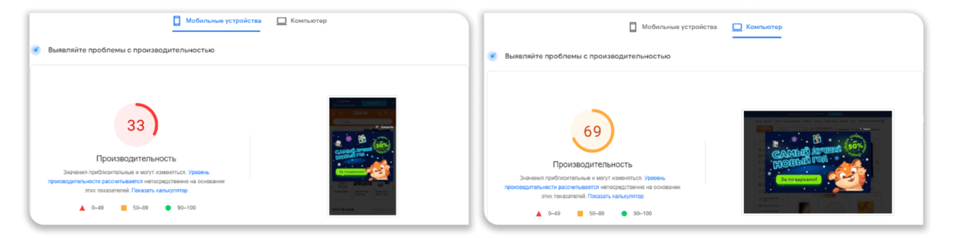 До внедрения Nuxt.js на мобильных устройствах страницы сайта загружались медленно и с ошибками. В веб-версии показатель быстродействия сайта был неплохой, но хотелось его улучшить.