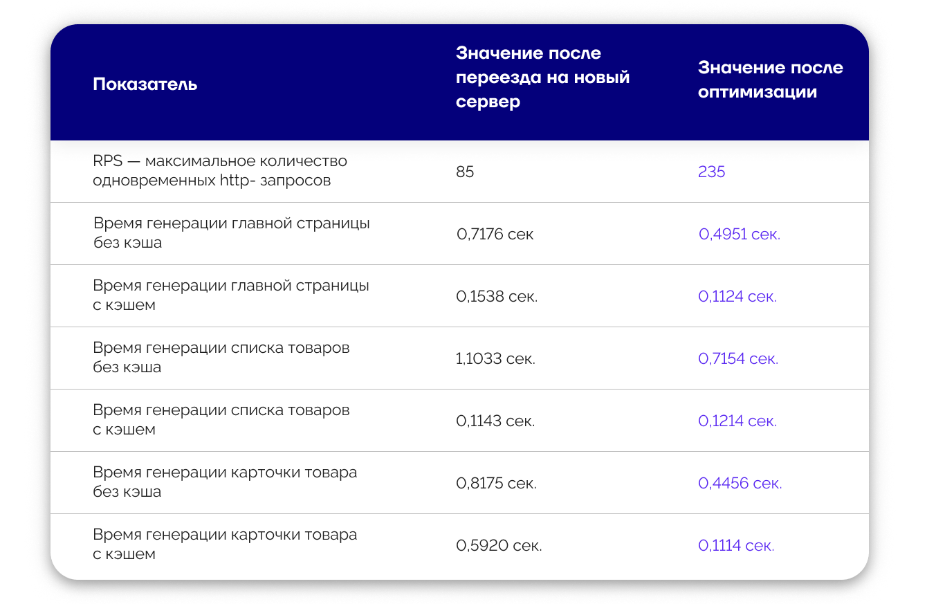 Нам удалось сократить время генерации страниц и увеличить RPS в 2,8 раза. Сайт стал быстрым и надежным. Это вызвало рост числа заходов из поисковых систем и подняло конверсию. Заказчик не боится запускать рекламные кампании, так как знает, что сайт выдержит не только резкий рост нагрузки, но и DDoS-атаку.