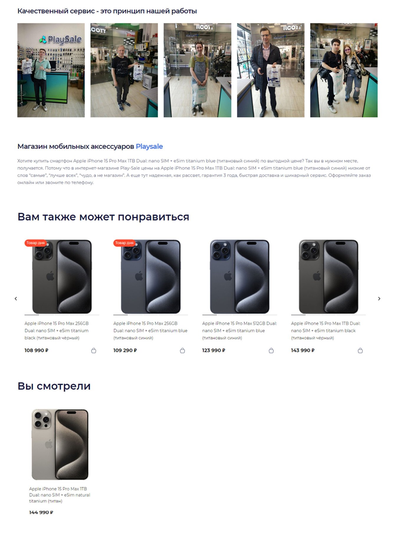 Дополнительно представлены SEO-текст, галерея клиентов и просмотренные товары — всё это повышает вовлечённость и способствует возвращаемости пользователей.