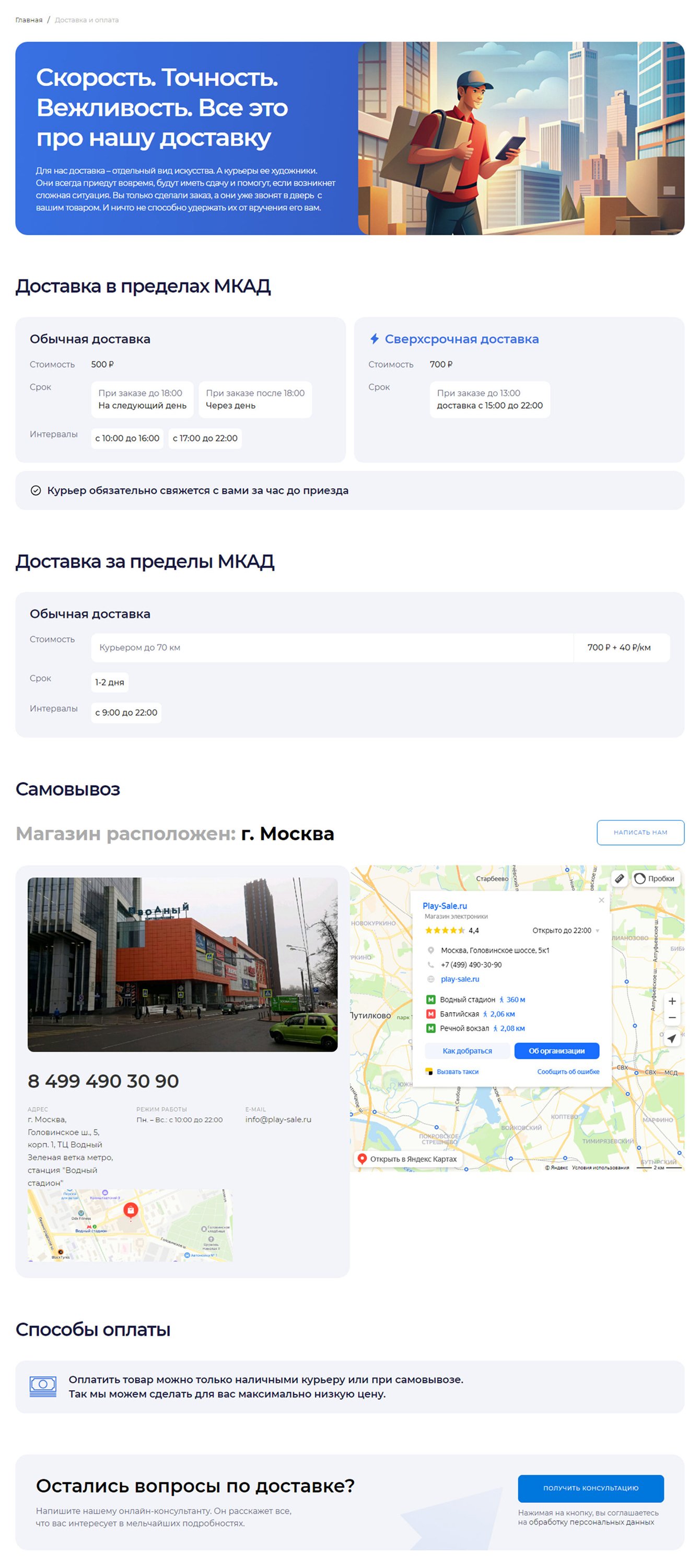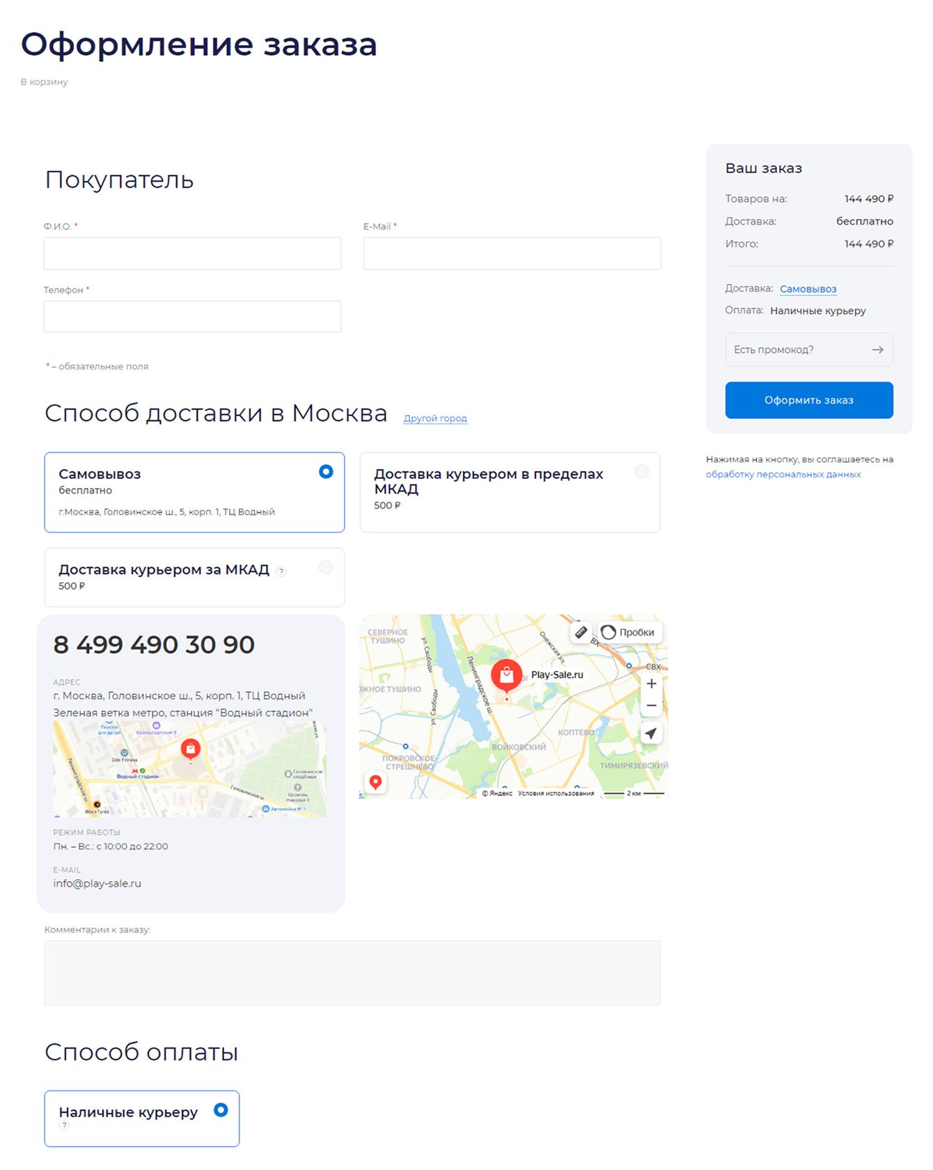 Акцент на скорость и удобство. Пользователь заполняет только необходимые данные, выбирает способ доставки и оплаты в несколько кликов.