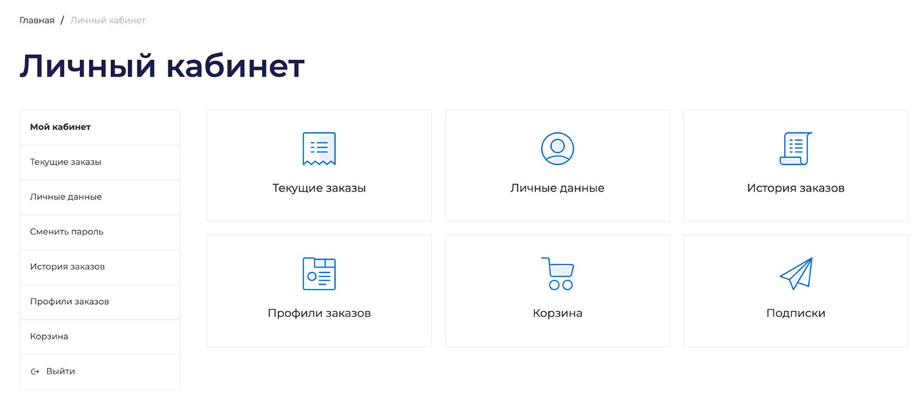 В нём доступна история заказов, редактирование личных данных и настройка подписки на новости, что повышает вовлечённость и удержание клиентов.