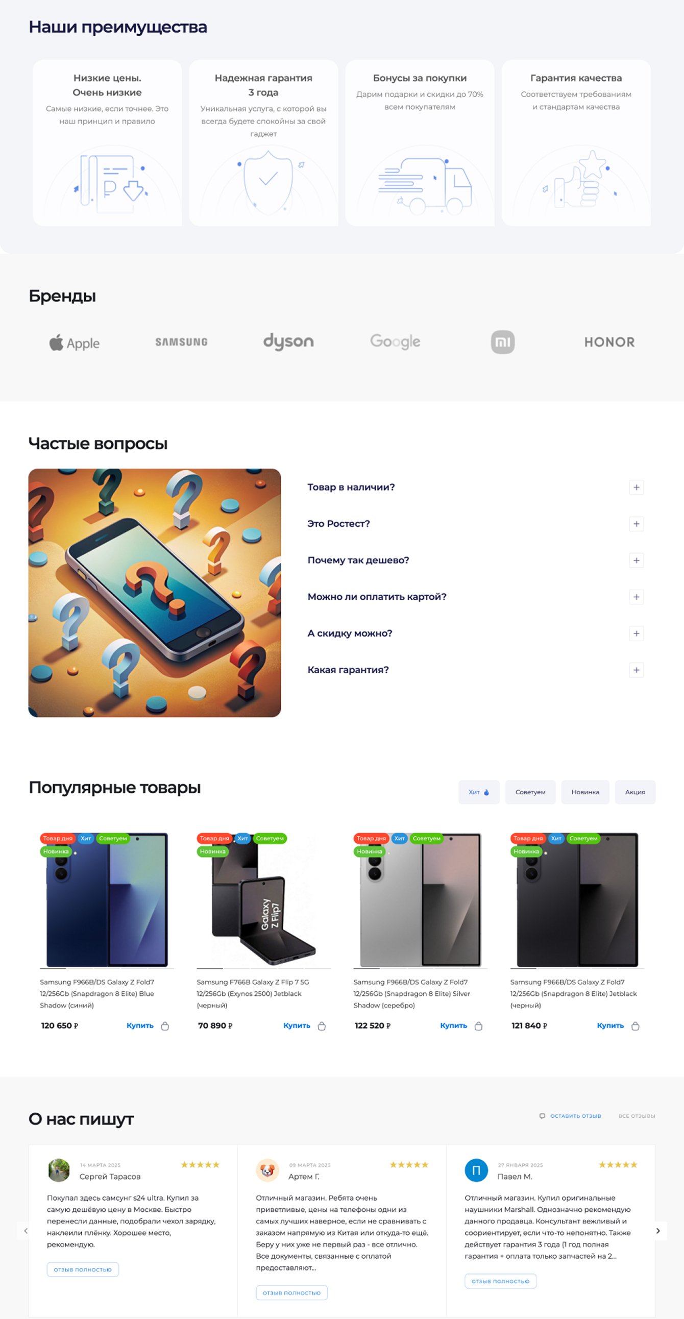 Баннеры с акциями и новинками привлекают внимание к ключевым предложениям, блоки с популярными товарами, категориями и брендами упрощают навигацию и стимулируют интерес к ассортименту. Раздел с отзывами усиливает социальное доказательство.