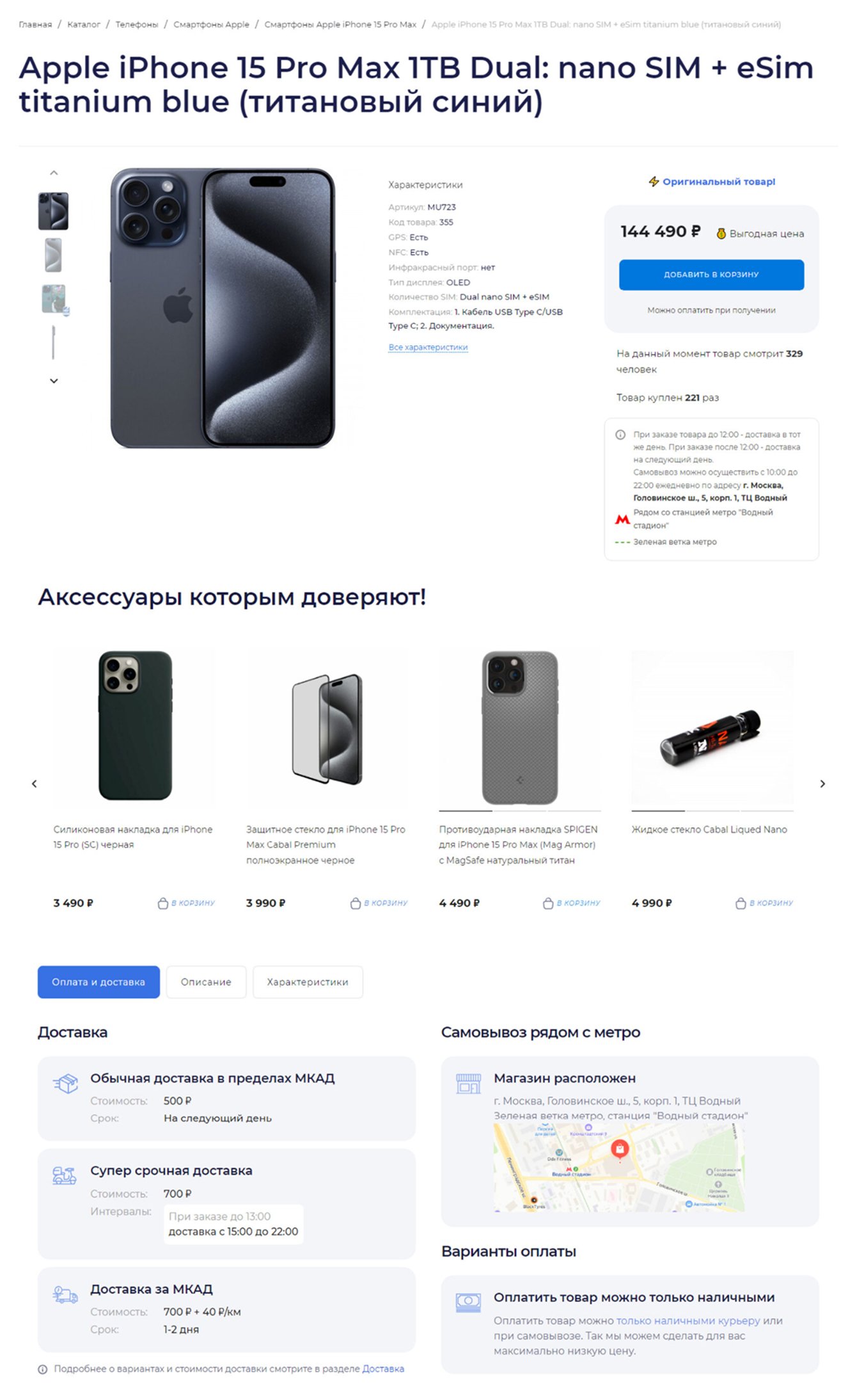 Верхний блок включает фотогалерею, характеристики, цену и кнопку «Купить», а также информацию об оплате и доставке. Ниже размещено подробное описание товара, блоки с аксессуарами и похожими товарами для увеличения среднего чека.