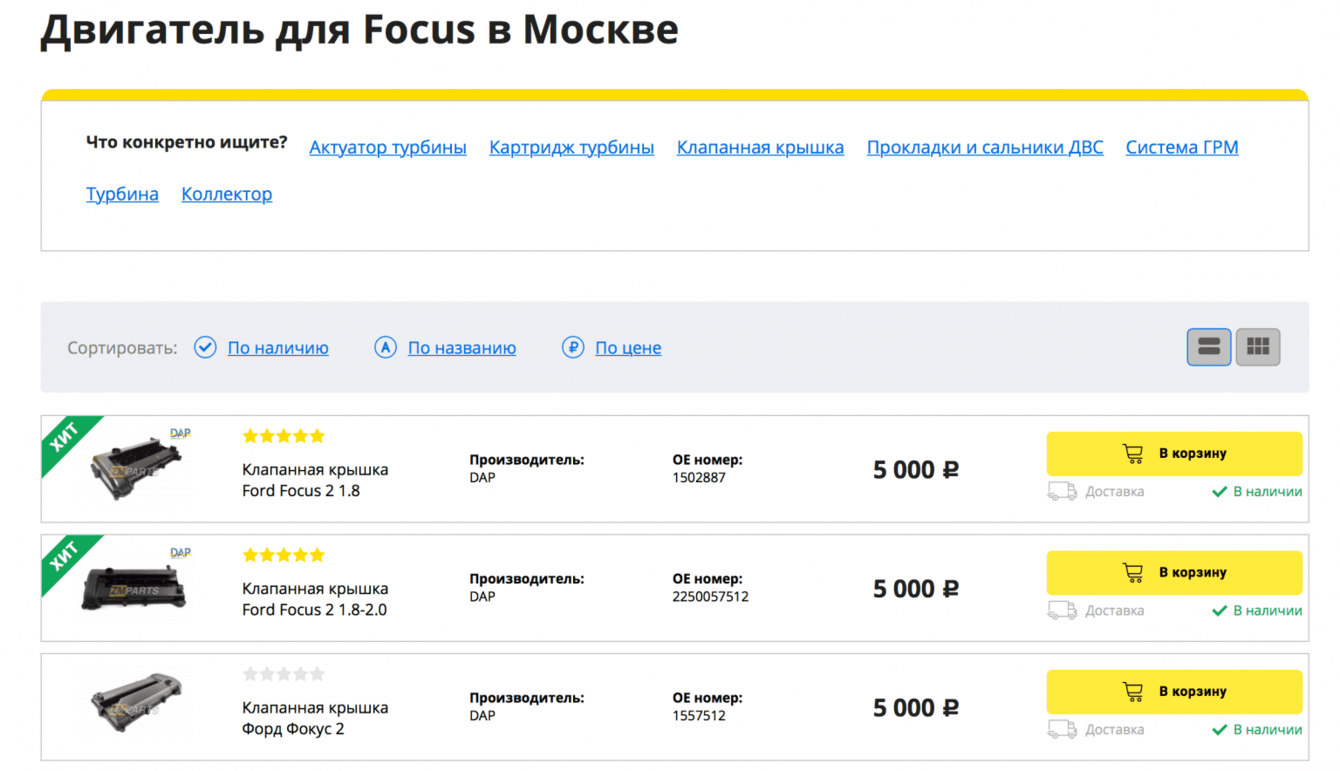 Мы предложили клиенту внедрить целую отдельную категорий каталогов с посадочными страницами по аналоговым номерам. Поисковый анализ показал, что по таким запросам 24531-42500, CJ5Z6268A, 2430TK0074, 5101191, 5101194, 5101199, 5119629, 5324793 есть микро-спрос. Занять выдачу не составит никакого труда. К тому же потенциал конверсий по таким запросам велик.