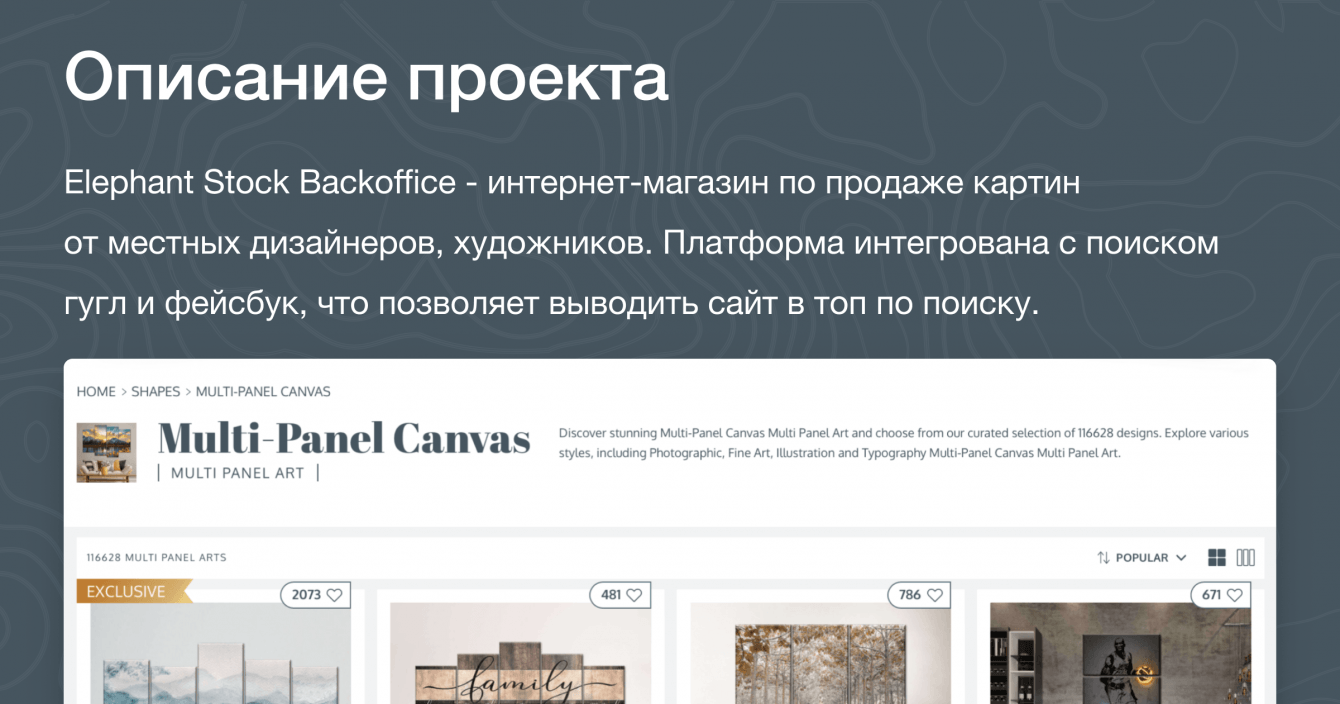 Командой разработки были реализована работа с древовидными структурами данных, а также инструменты для редактирования оформления своих работ дизайнерами и компонент для работы со сторонними сервисами-агрегаторами стоковых изображений.