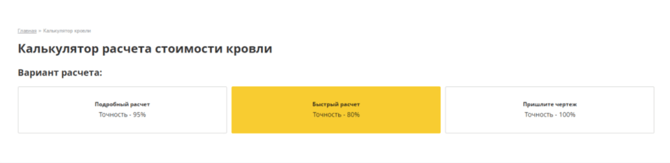 Кровля может быть разного типа. В отличии от большинства калькуляторов кровли тут доступны все популярные типы: односкатная, двускатная, четырехскатная, шатровая, мансардная, полувальмовая. В зависимости от выбора, клиент заполняет соответствующие параметры. Необходимо было также предусмотреть навыки пользователей. Поэтому мы разработали три варианта расчета: