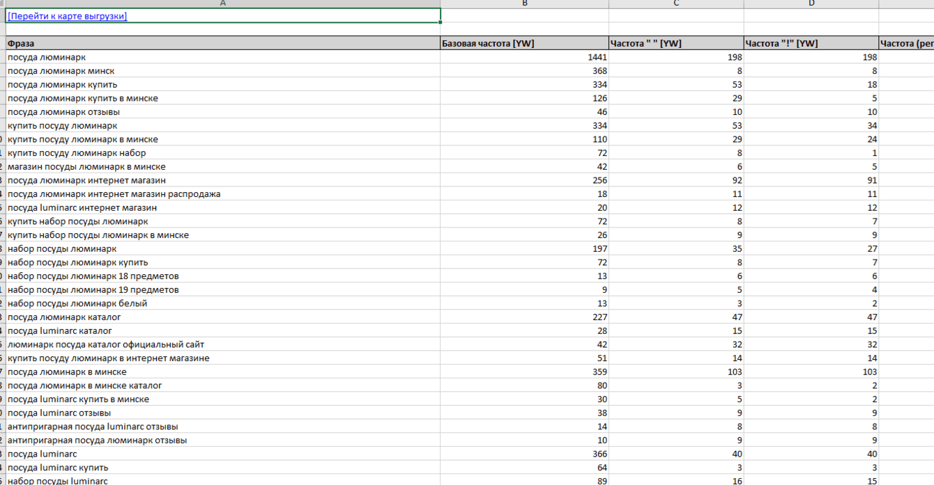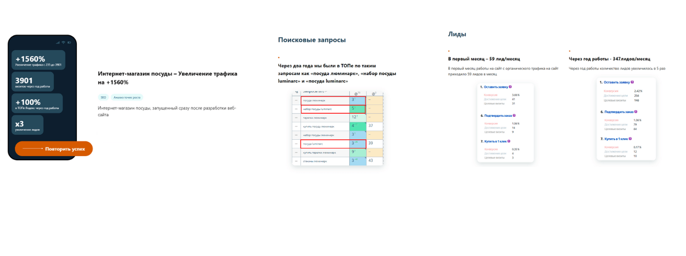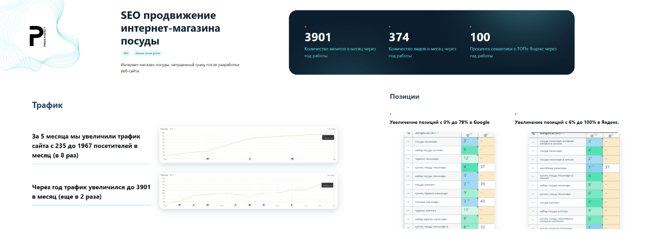 - Через два года сайт вышел в ТОП по таким запросам, как «посуда люминарк», «набор посуды luminarc» и «посуда luminarc».
