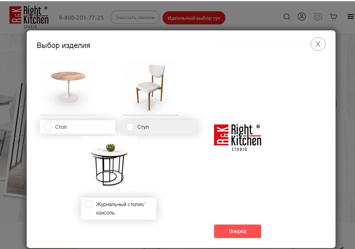 Клиент Right and Kitchen - производство обеденных групп. Задача разработать сайт интернет-магазина с квизом по выбору индивидуальных параметров для столов или стульев. Возможность оплатить онлайн, заказать доставку.