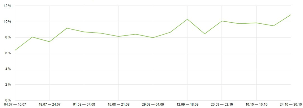 К октябрю конверсия с карточек товаров увеличилась в 1,7 раз (с 6,37% до 10,9%).