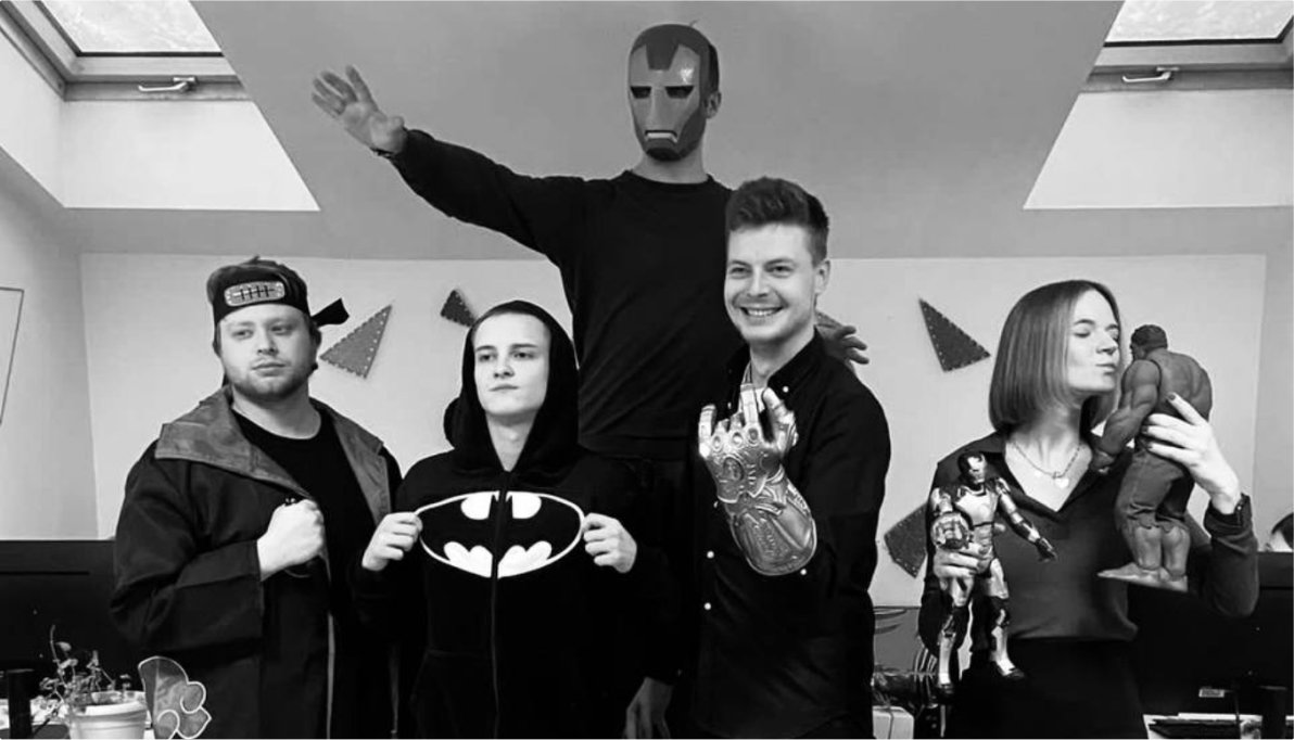 Команда Grampus — фанаты Marvel, поэтому мы прикупили в офис супергеройской атрибутики. Заказали на сайте kristianland.ru и получили первый статус “Человек-муравей”. Когда заказ пришел, сделали фото для истории: Ваня на минутку стал Железным человеком, а Настя одарила поцелуем Халка.