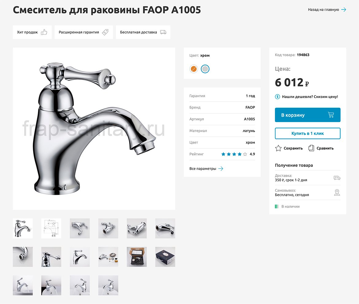 При создании сайта была поставлена задача сделать сайт, который будет лидером по бренду Frap (конкурентов очень много по данному бренду), мы со своей стороны сделали максимально удобный, быстрый интернет-магазин с большим набором функционала. Ниже на скриншоте представлен основной блок карточки товара: