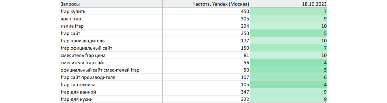 Большинство высокочастотных и среднечастотных запросов вошли в ТОП-10 в Яндексе после 2 месяцев существования сайта. Ниже показана выгрузка из программы Topvisor за 18 октября 2023 года