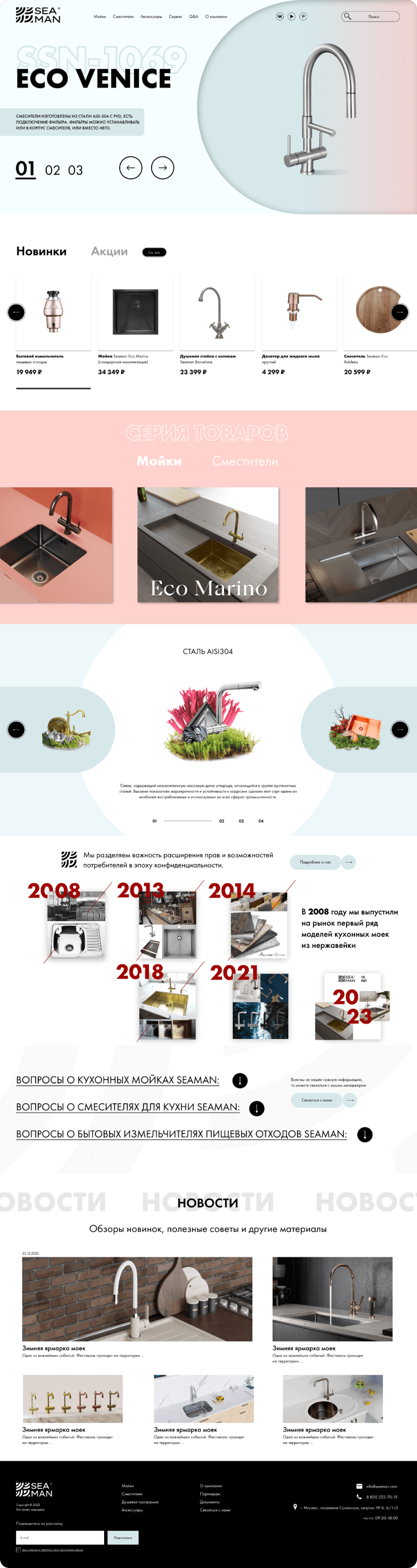В рамках тендерного задания необходимо было создать концепт функционального сайта для нового интернет-магазина SEAMAN. Предстояла плотная работа над созданием дизайн концепции сайта по товарам сантехники SEAMAN в рамках брендбука.