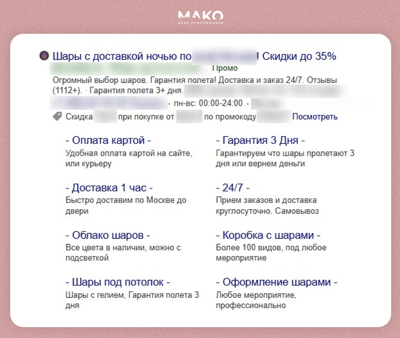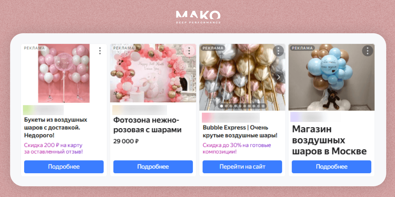 Большую часть бюджета вкладывали в срочный спрос на Поиске, так как с него приходило больше заявок. Делали акцент на общие запросы, например «купить шарики срочно».