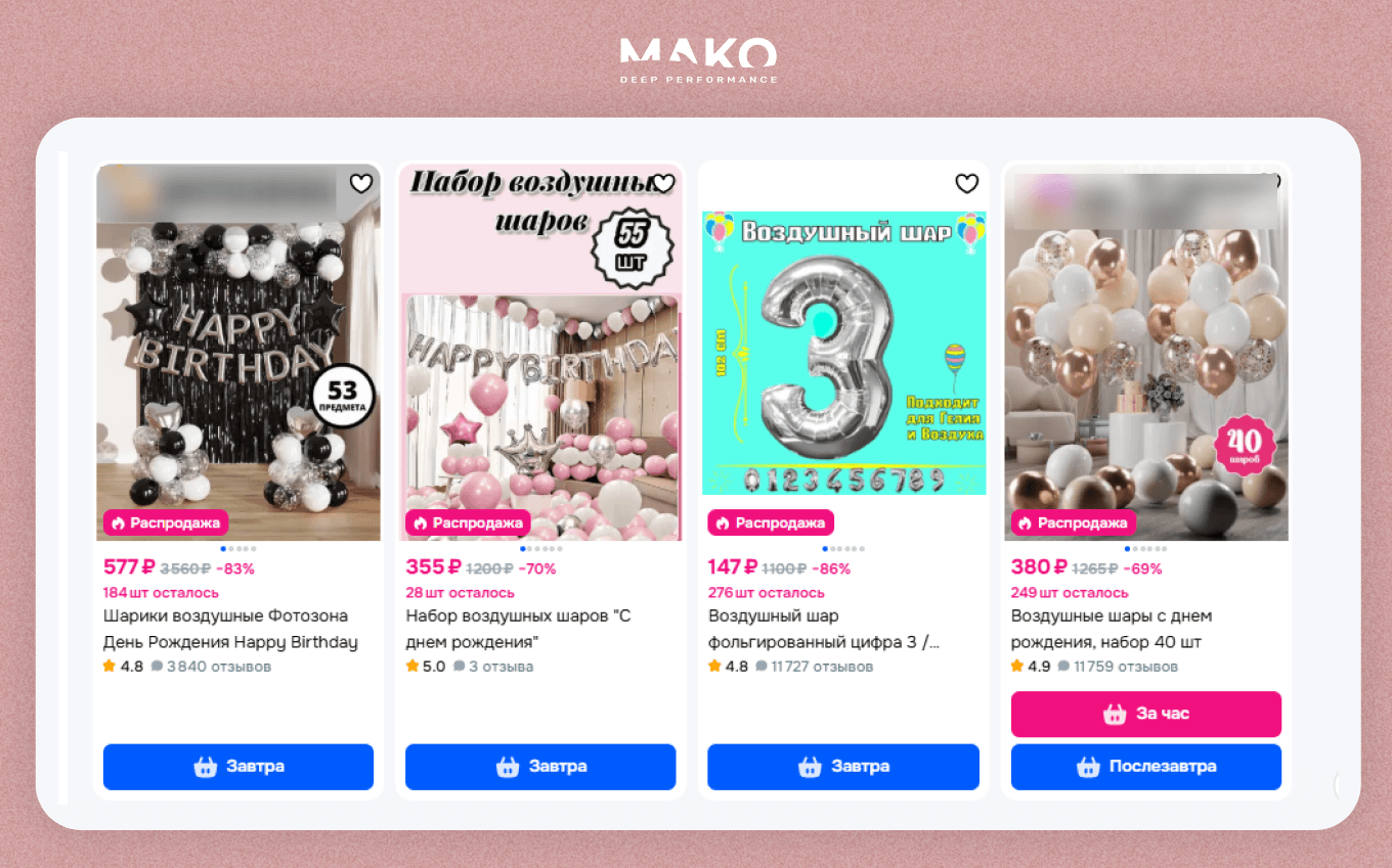 Но пользователи начали куда-то уходить, в какие-то другие каналы — на маркетплейсы, например, где появилась масса предложений, а цены были ниже в разы. Плюс, покупки на этих площадках избавляли от проблем с доставкой — не нужно встречать курьера, который придет с огромным количеством шаров.