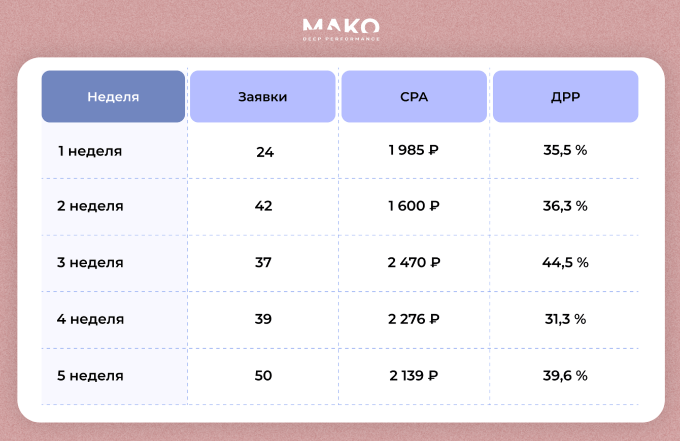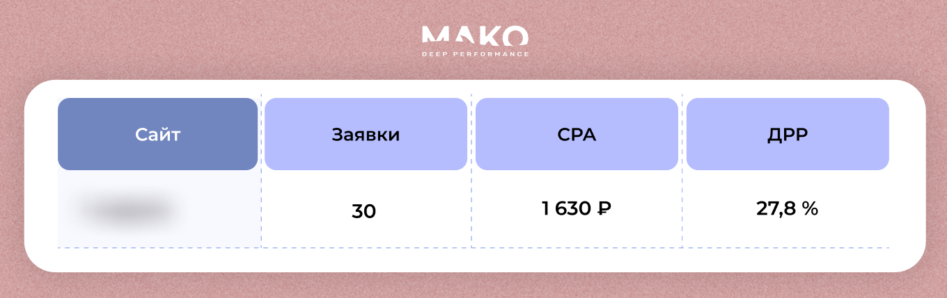 Это самый выгодный сегмент, потому что себестоимость низкая, цена услуги доступна для ЦА и ДРР (долю рекламных расходов) можно удерживать на уровне 40%, что было прибыльно на этом проекте.