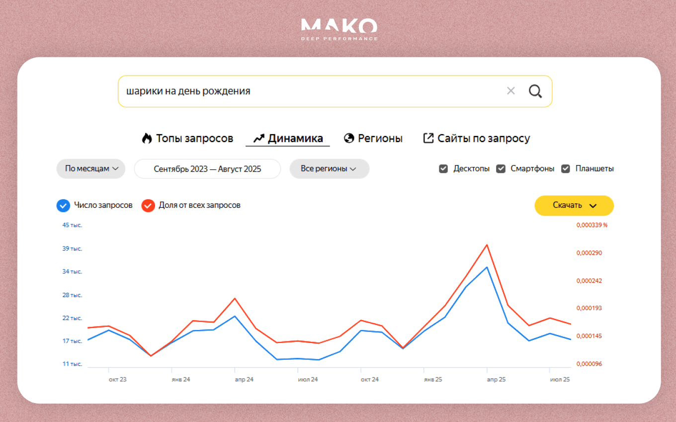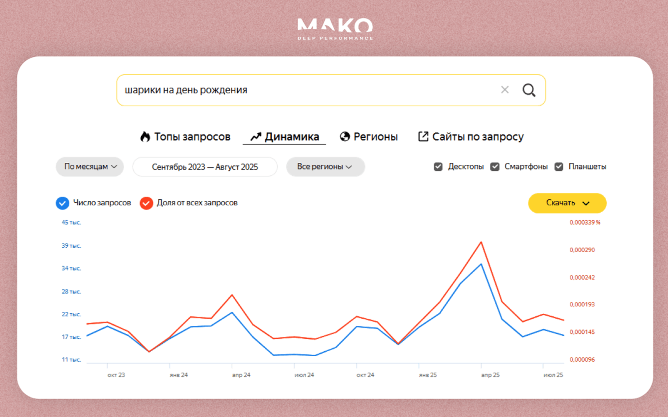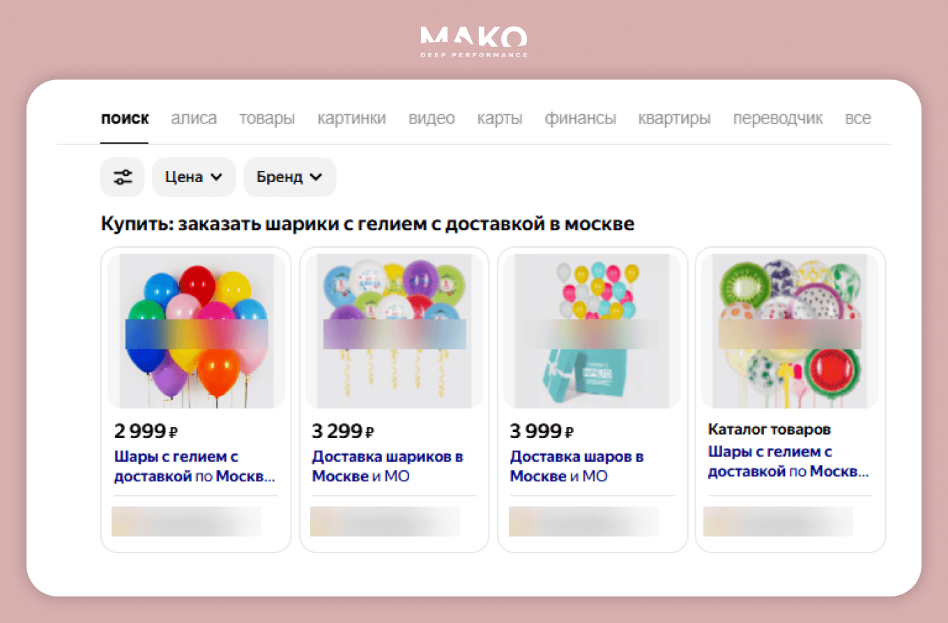 Стратегия управления импульсивным спросом и срочными заказами опиралась прежде всего на Поиск в Яндексе. Именно здесь концентрировалась горячая аудитория, которая искала товары интернет-магазина воздушных шаров, чтобы купить здесь и сейчас.