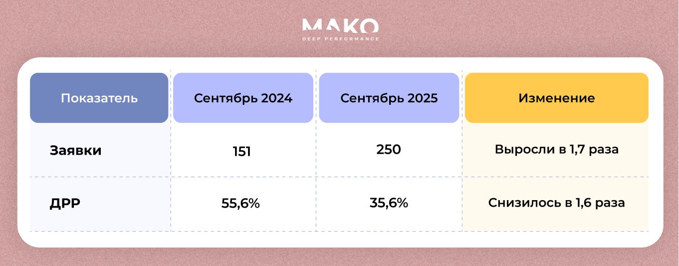 Итоговые результаты: если сравнить сентябрь 2025 г. с сентябрем 2024 г., то заявки выросли в 1,7 раз с 151 до 250, а ДРР снизились с 1,6 раза 55,6% до 35,6%