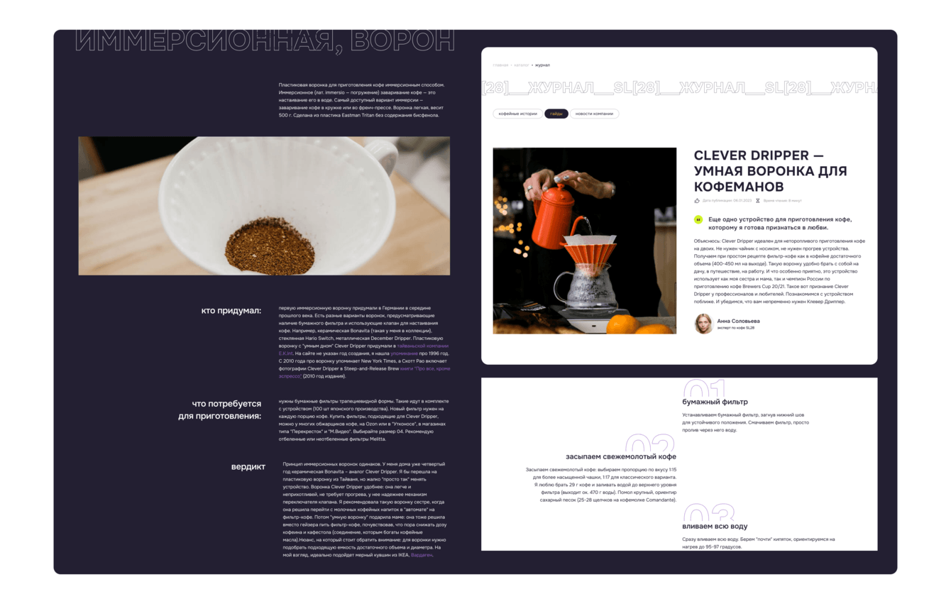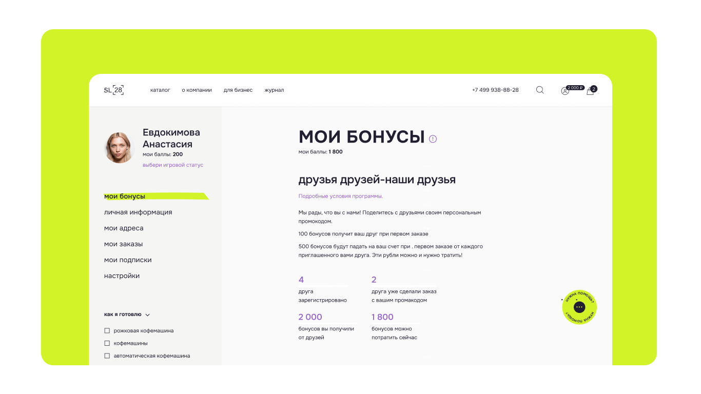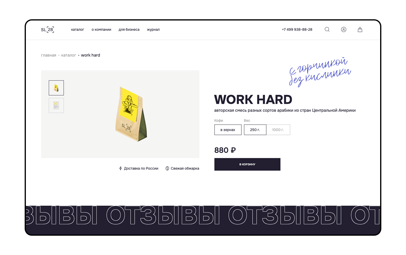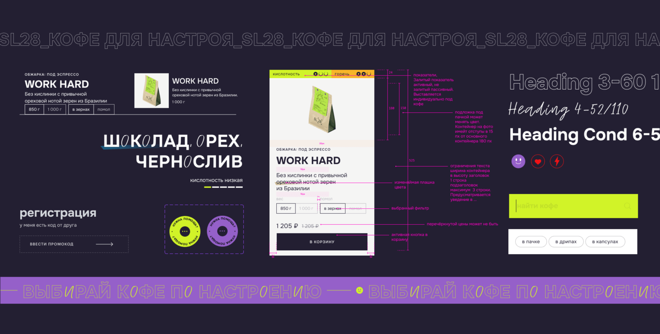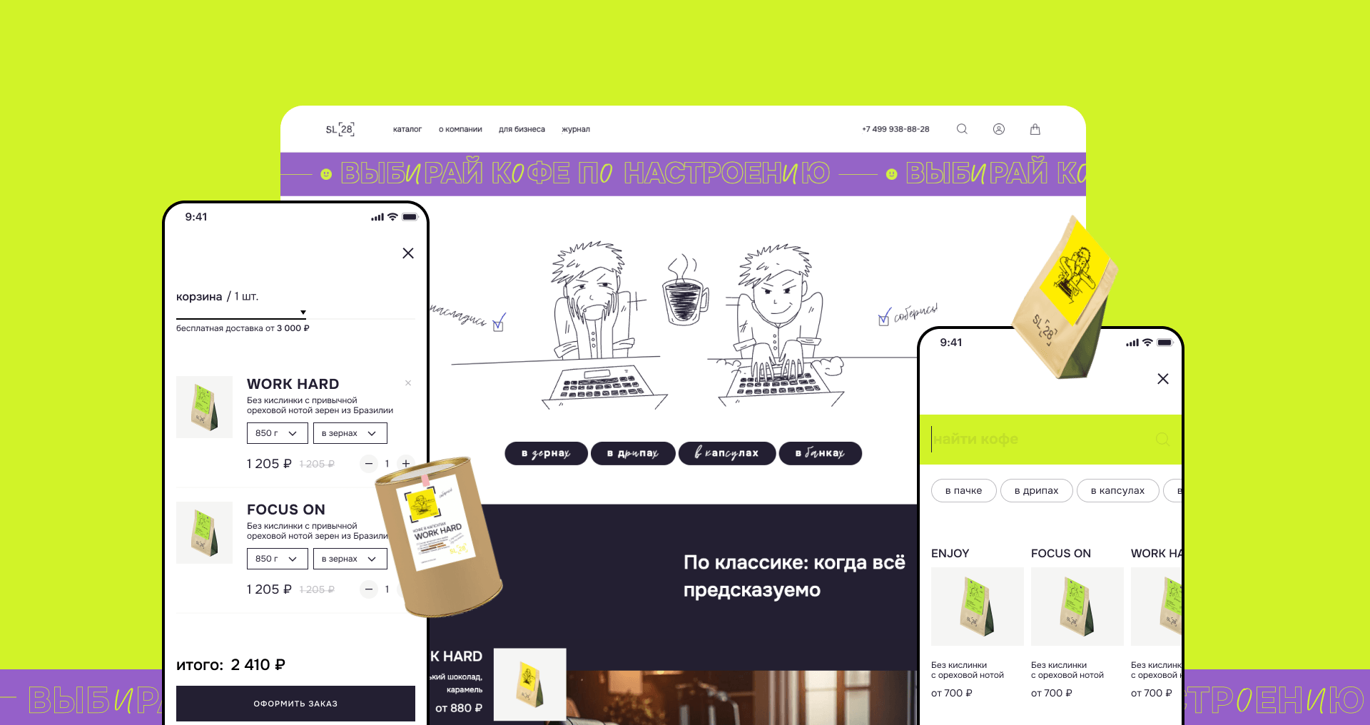 SL28 — это интернет-магазин, где можно купить кофе, соответствующий вашему настроению: Work Hard, Focus On, Enjoy и т.д. Главная идея — помочь клиентам легко выбрать желаемый сорт кофе и быстро оформить заказ, минимизируя количество дополнительных действий и лишних нажатий.
