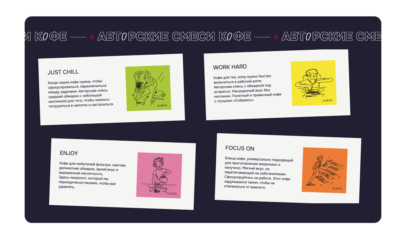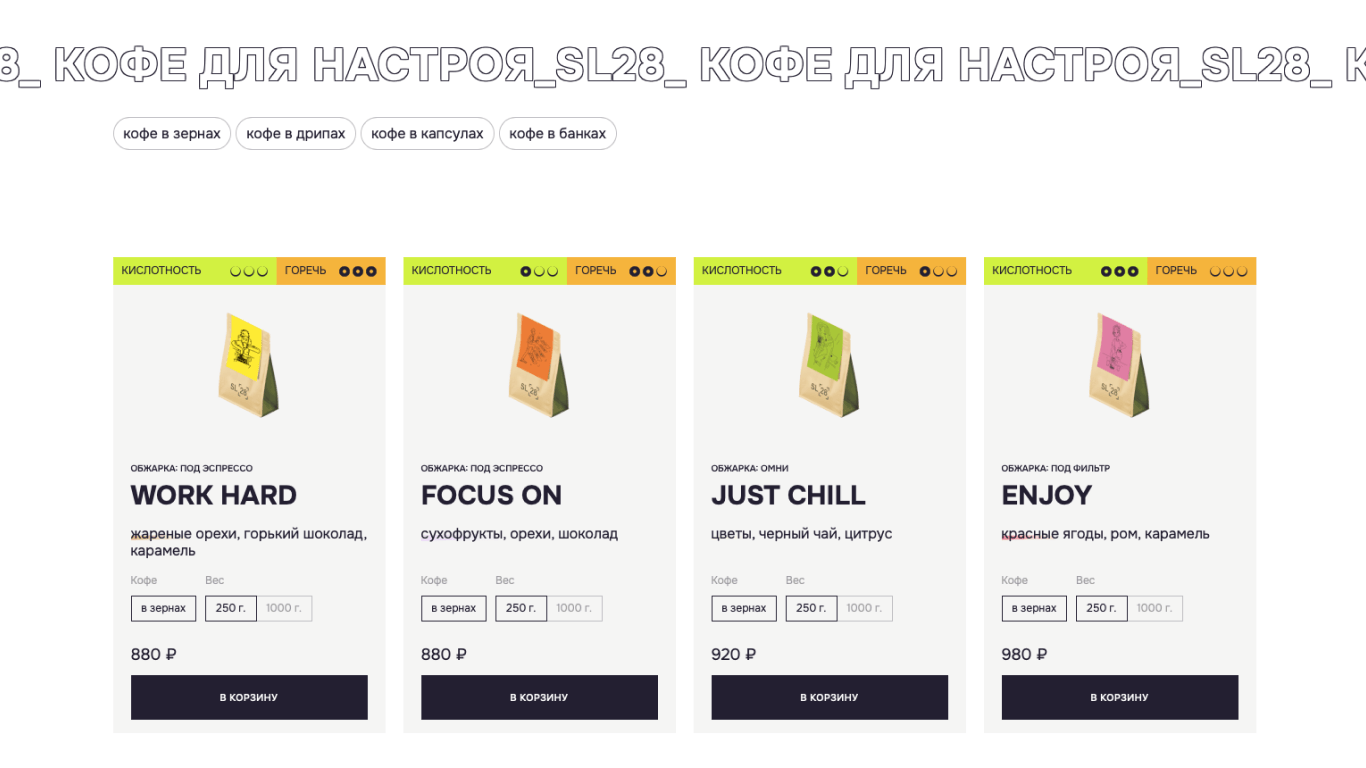 Парадокс заключается в том, что чем больше выбор, тем сложнее покупателю определиться. На SL28 пользователям проще принять решение о покупке, так как сеты кофе оформлены в тематические подборки: Work Hard, Focus On, Relax, Just Chill, Enjoy. Например, Just Chill создан для тех, кто предпочитает напиток без кофеина.