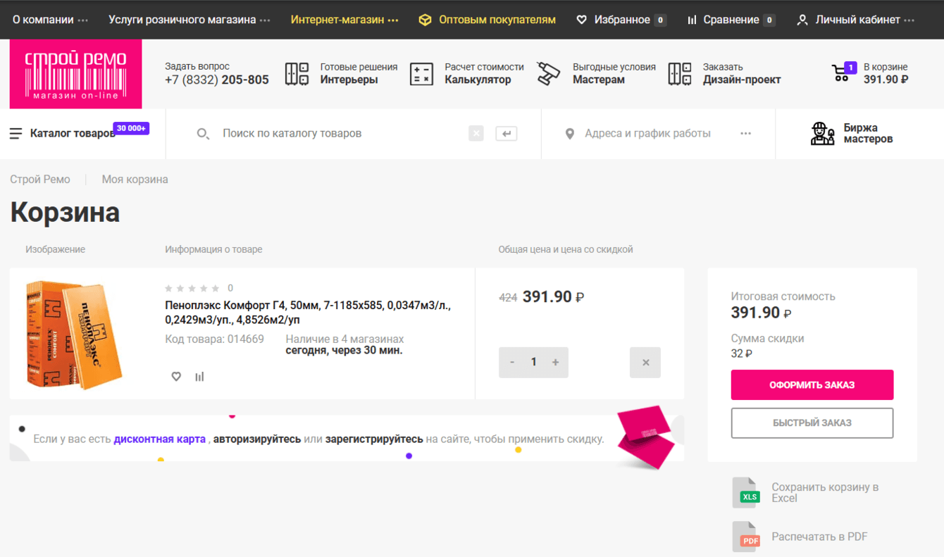 Личный кабинет пользователя с историей заказов - для возможности дублирования заказа. Также покупателями магазинов являются строительные компании/ мастера, у которых есть потребность выгружать заказ или корзину в виде сметы, что мы и предусмотрели. Заказом можно поделиться, а также выгрузить в удобном фомате (pdf, excel)