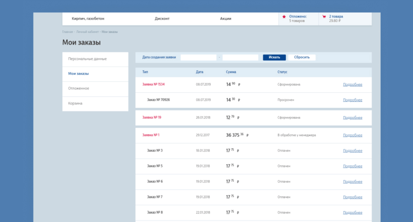 3. Статусы заявок и заказов в личном кабинете;