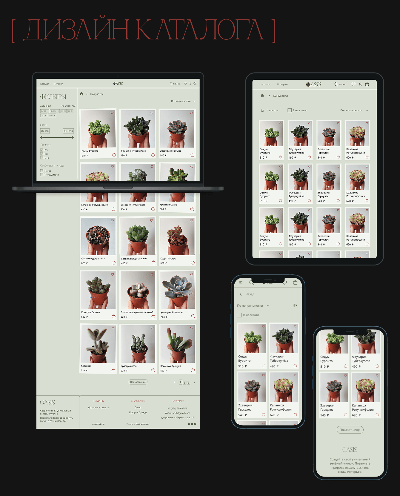 Использовала нежную пастельную палитру, подчеркивающую естественную красоту растений. Реализовала интуитивную систему фильтрации по параметрам и наглядные карточки товаров с демонстрацией растений на разных стадиях роста, что помогает лучше понять особенности суккулента.