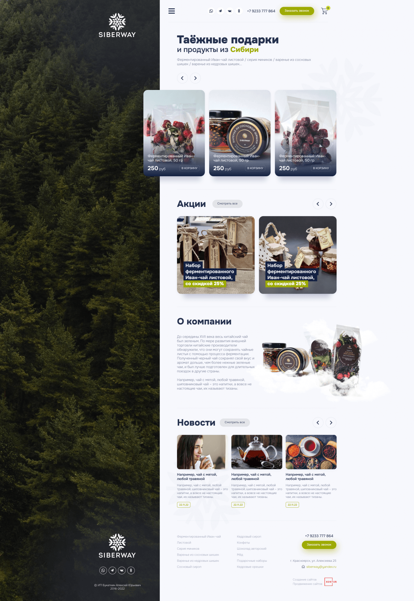 Дизайн сайта был разработан с учетом фирменного стиля, использовались приглушенные и природные цвета для воссоздания таежной атмосферы. Баннеры на сайте отображали места сбора сырья для продукции.
