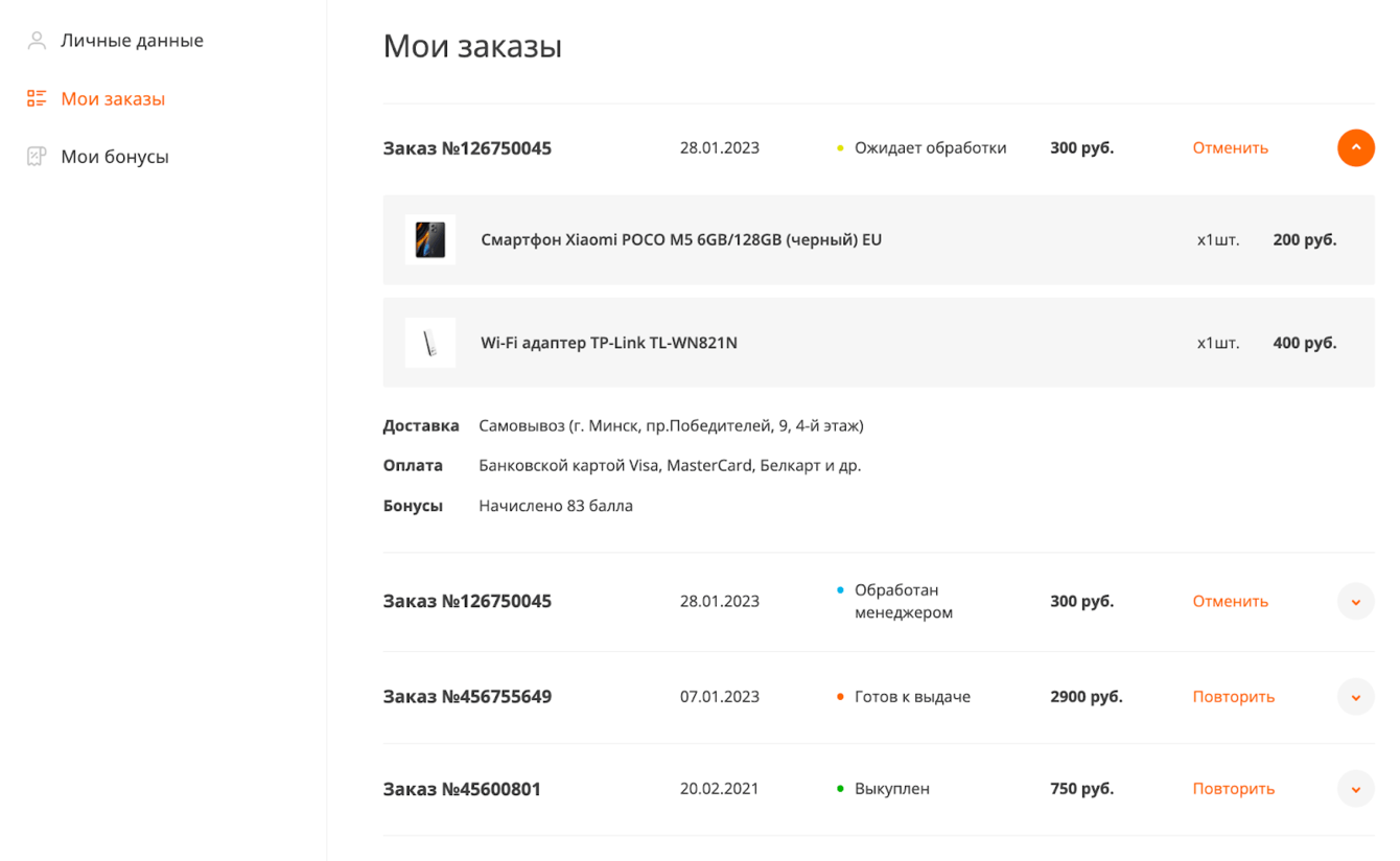 Мы создали с нуля персональный кабинет для клиентов, обеспечив его всеми необходимыми функциями для простоты совершения покупок и мониторинга статусов заказов.