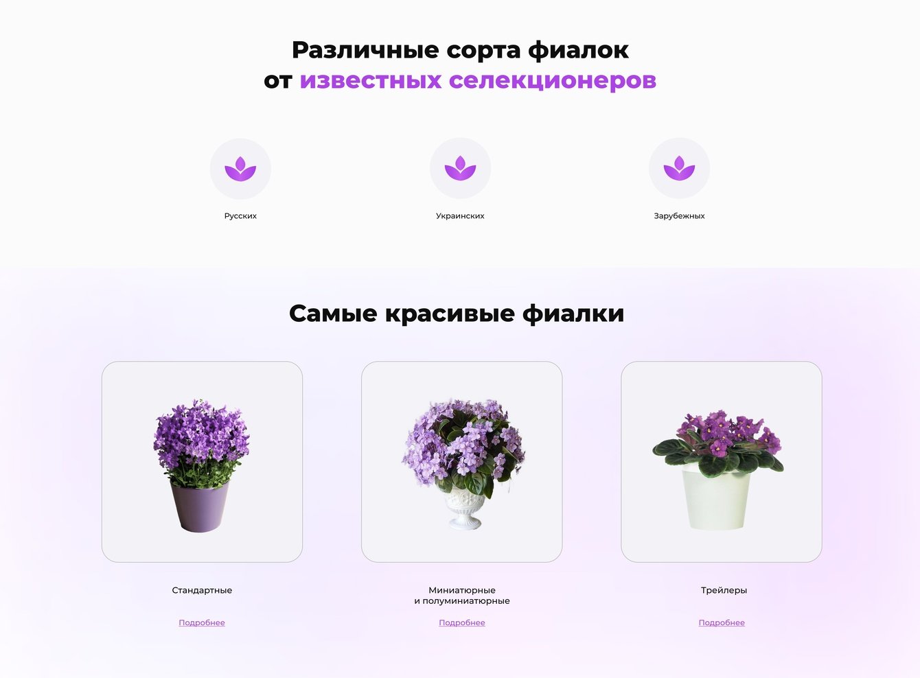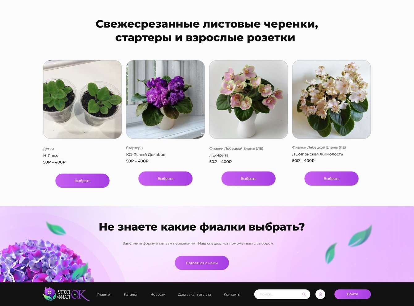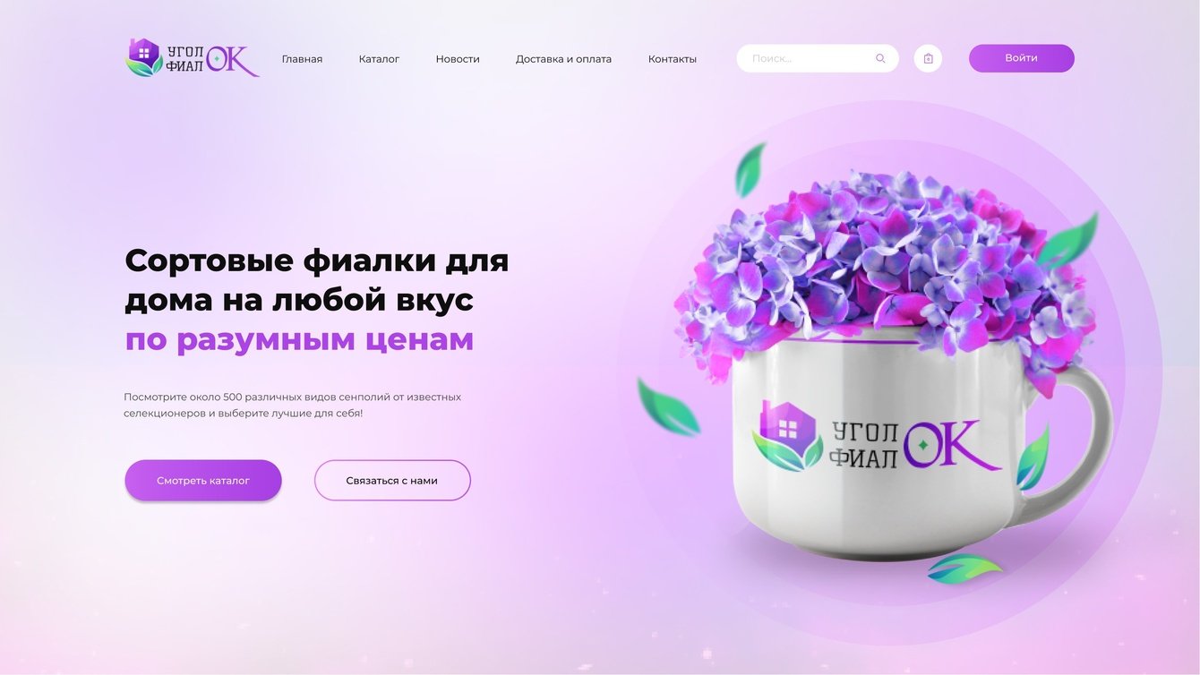 Сделали акцент на продающем оффере (заголовке), который описывает преимущества бизнеса и выгоду для потенциального клиента, на изображении с фиалками и логотипе.