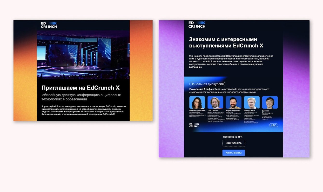 Мы написали 20 email-писем об EdCrunch X с целью продажи билетов, а также дальнейшего сопровождения. Отправляли по базе клиента — 70 000 человек.