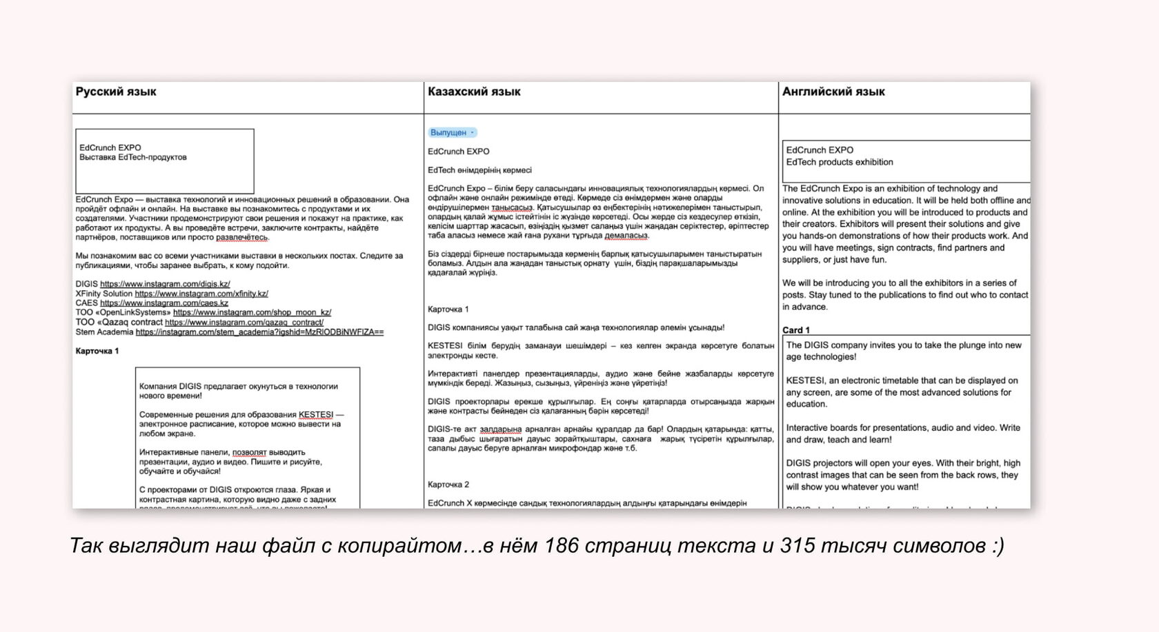 Для этого мы переводили контент на 2 языка — казахский и английский.