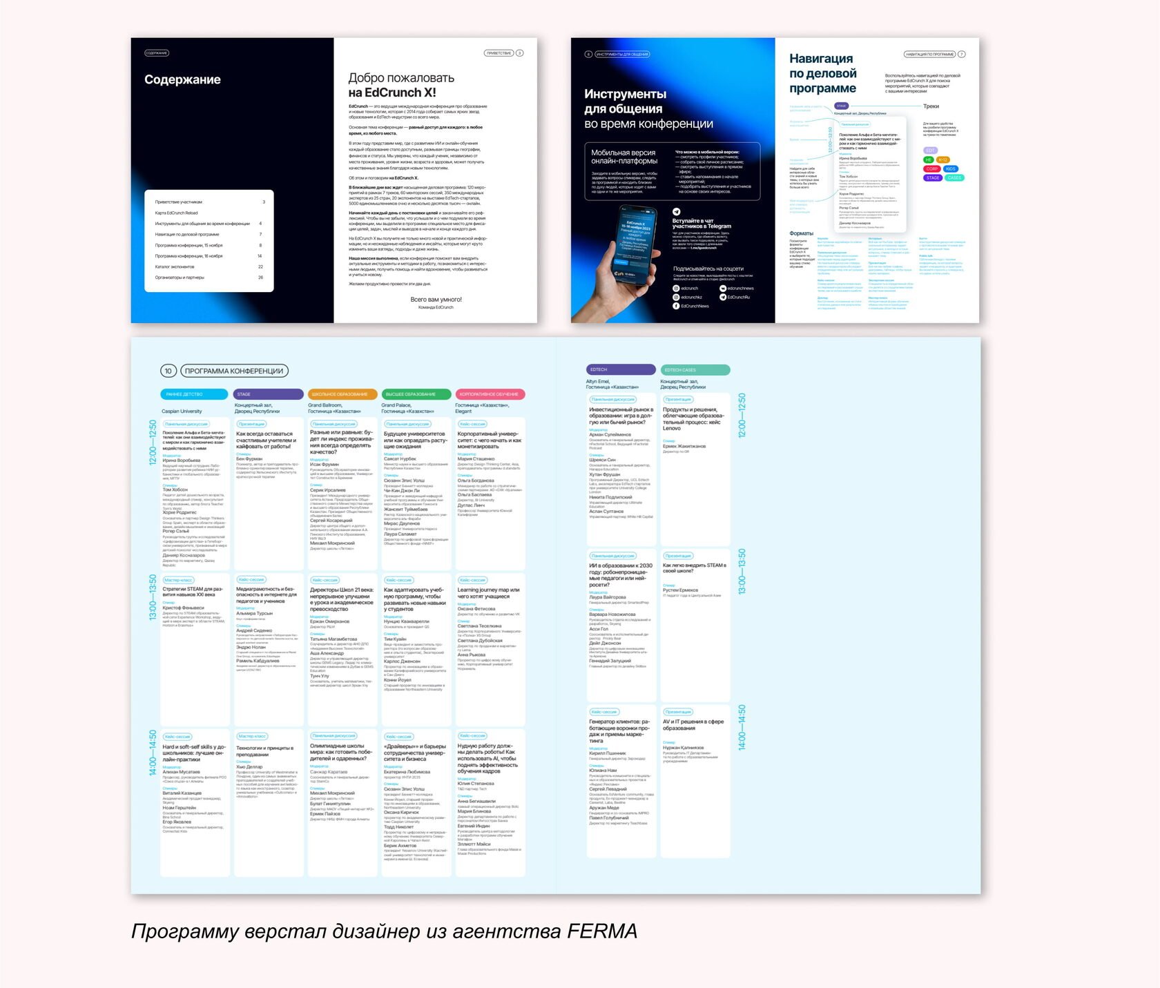 Сверстали и задизайнили программу конференции. В этом году организаторы решили не печатать программы, а разместить её в электронном формате по QR-коду. Поэтому мы адаптировали программу в пдф-формат и вносили правки вплоть до второго дня конференции. Всё из-за того, что кто-то из спикеров не приехал, кто-то заболел уже в Алматы, а кто-то решил изменить тему своего выступления.