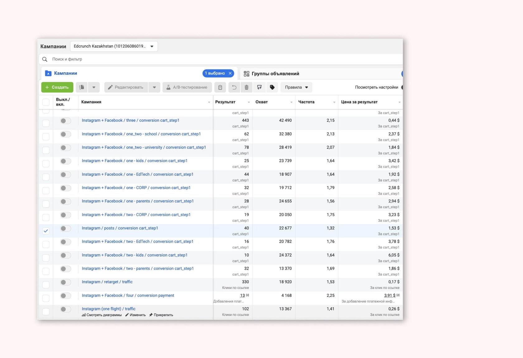 – суммарно запустили 18 рекламных кампаний, где каждая была поделена ещё на отдельный сегмент аудиторий;