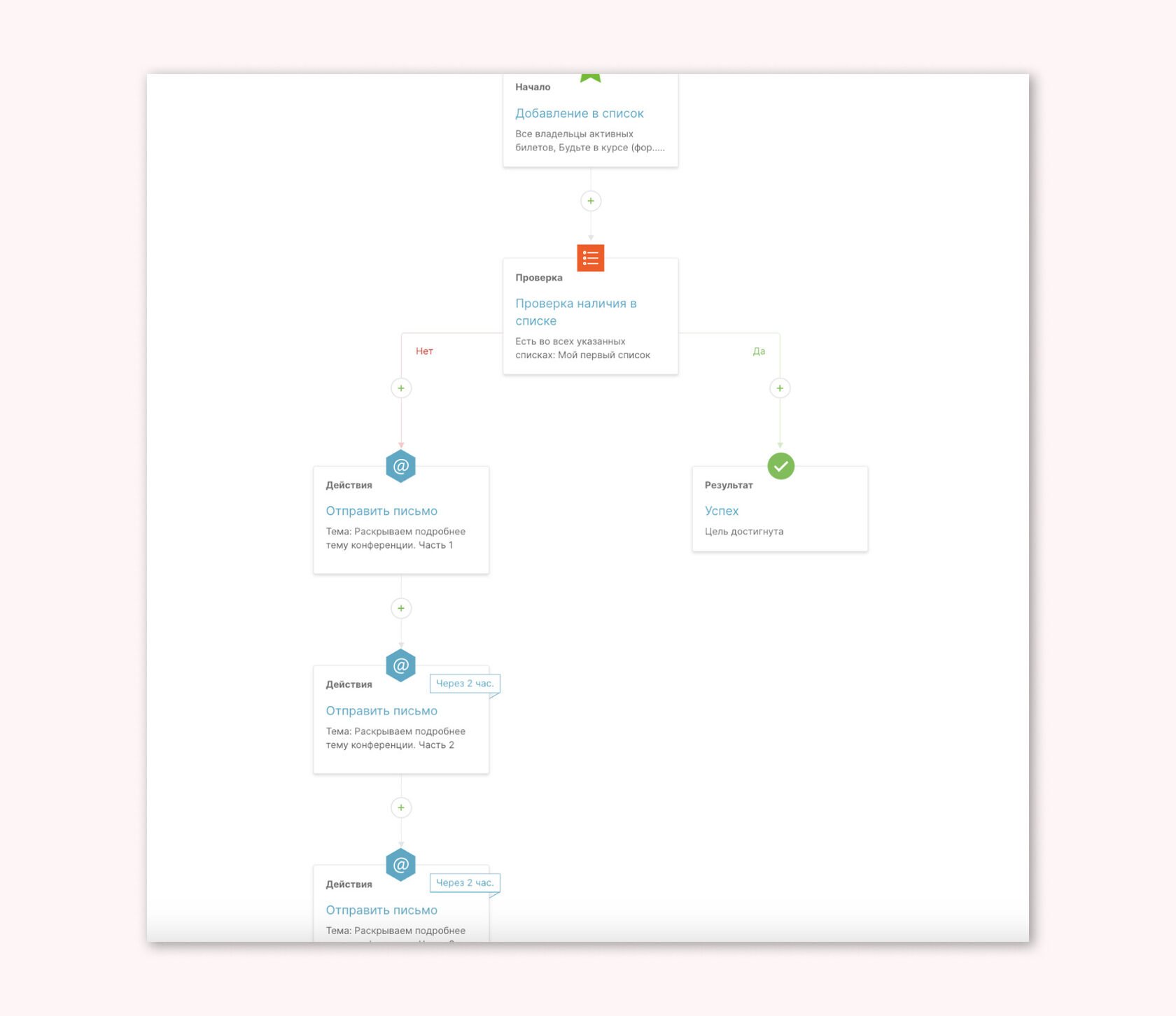 Кроме этого, мы настроили автоматизацию отправки писем покупателям билетов и написали 12 писем для велком-цепочки: