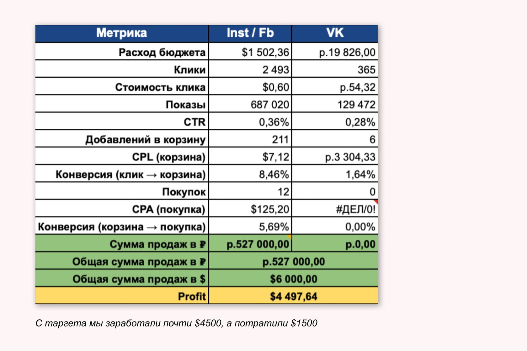 Из-за того, что задачи по запуску менялись в моменте, Фейсбук выставил лимит $50 в сутки. Это сильно повлияло на качество конверсий: местами приходил не самый целевой трафик, который только смотрел, но ничего не покупал.