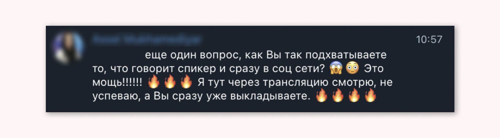 Иногда даже умудрялись привлекать переводчиков на английский, чтобы в режиме реального времени постить публикации и отмечать аккаунты спикеров в Линкедине.