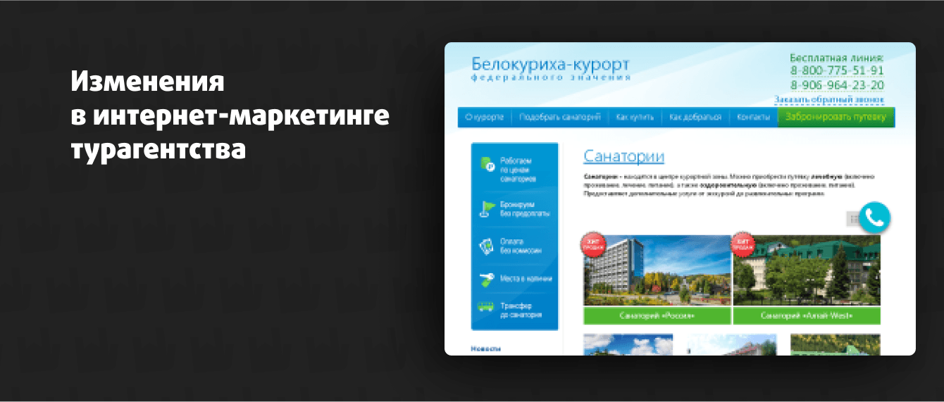 Массово продавать услуги через интернет санатории начали сравнительно недавно. Казалось, что на сайте (без консультаций дополнительных косультаций) сложно выбрать подходящий формат лечения, да и аудитория не та.