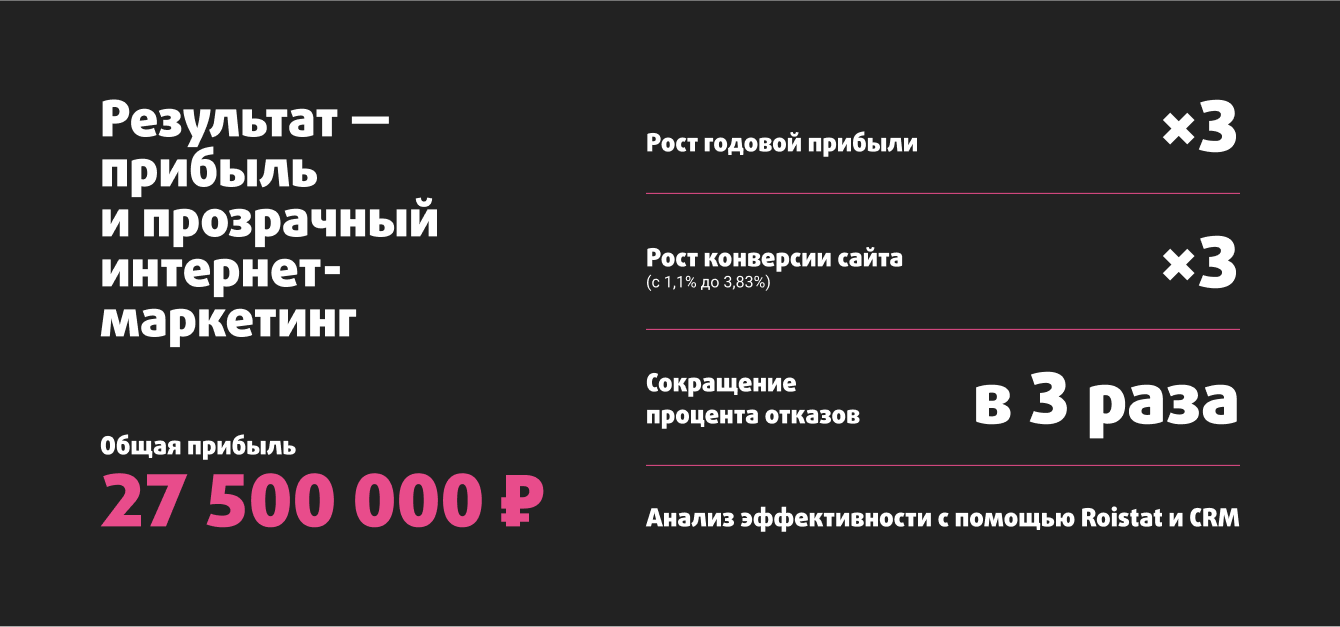 За два года компания «Белокуриха-курорт» с нашей помощью заработала 27,5 млн рублей. Прибыль выросла в три раза. Если до сотрудничества клиент тратил на рекламу 250 000 рублей и зарабатывал 5,2 млн в год, то в конце — до 15,5 млн, а один рубль, вложенный в интернет-маркетинг, приносил уже 6 рублей.