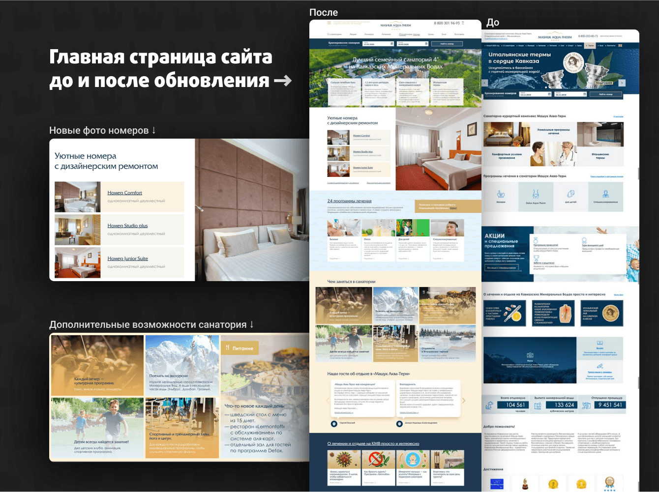 Обновление начали со страниц сайта, которые чаще приносили конверсии. На главной выстроили линию убеждения: рассказали про сильную лечебную базу, информацию подкрепили фактами (90% гостей приезжают по 6—8 раз, потому что лечение и профилактика дают эффект). Добавили фото номеров с современным ремонтом и перечислили преимущества санатория. Переделали раздел «Лечение», разделы с описанием спецпрограмм и таблицы с прайс-листами, а также привели в порядок адаптивную верстку.