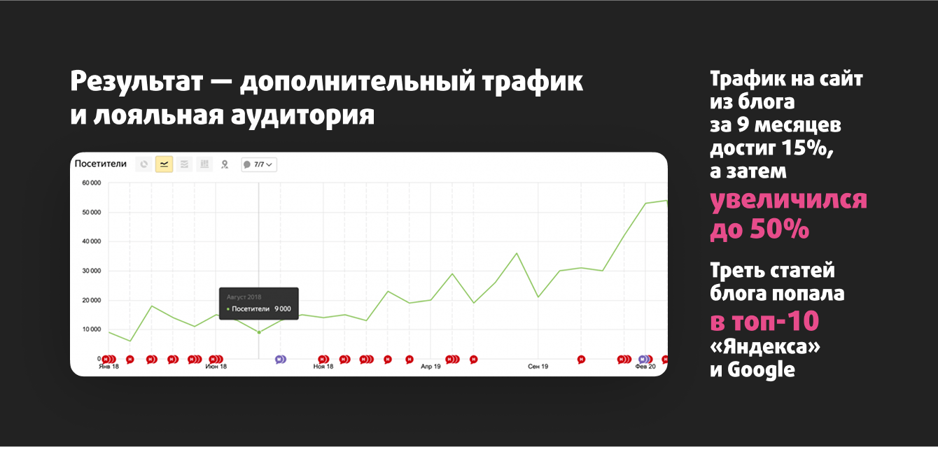 Результат: трафик на сайт из блога рос с момента старта в августе 2018 и по апрель 2020 года, когда из-за пандемии санаторий приостановил сотрудничество с агентством. Треть статей блога попала в топ-10 «Яндекса» и Google, а в топ 100 — абсолютно все. С помощью блога санаторий сформировал базу лояльных подписчиков, а качественный контент позволил стать экспертом в оздоровлении.