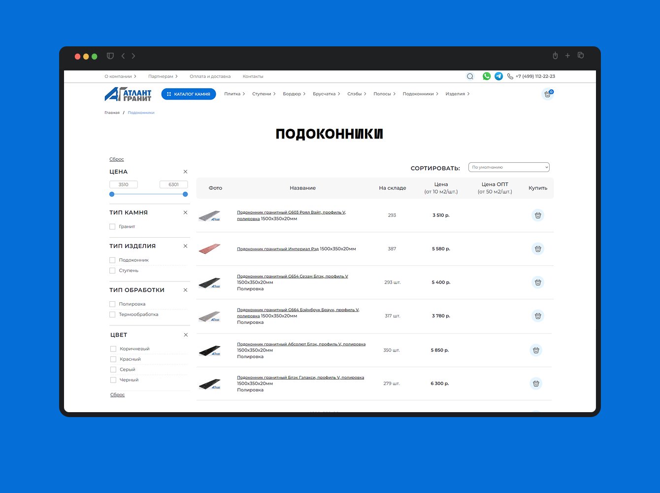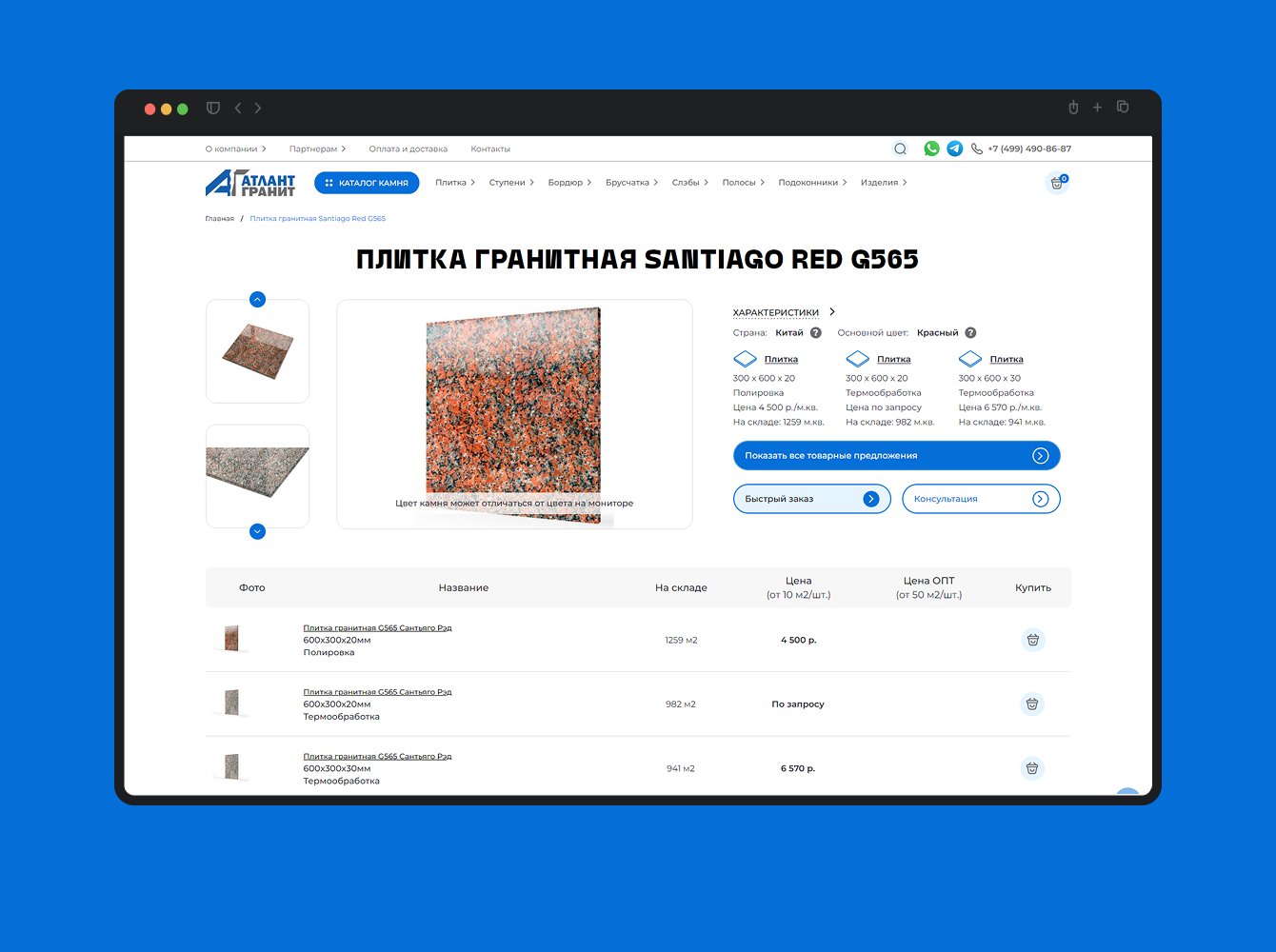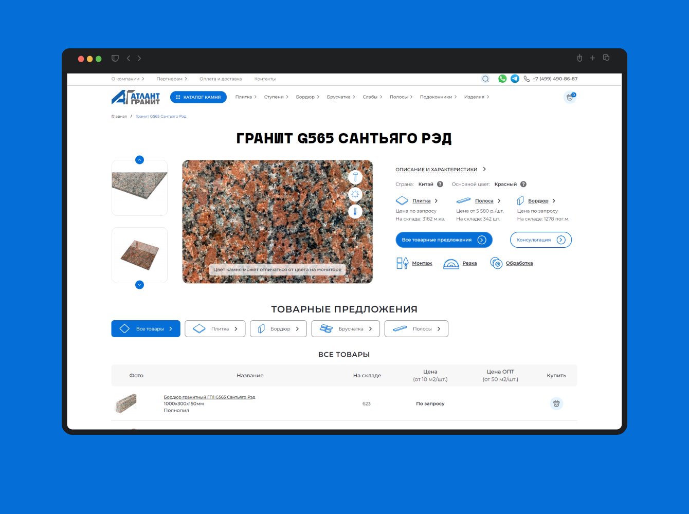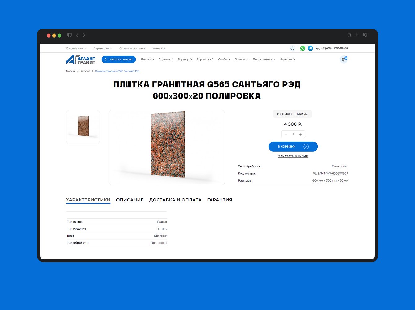 Было необходимо разработать интернет-магазин по продаже изделий из натурального камня — гранита, мрамора, травертина и других. Изделия — плитка, брусчатка, бордюры, слэбы, подоконники, полосы и другие — используемые в строительстве и отделке помещений и фасадов зданий. Так как компания занимается не только продажами, но и оказывает услуги по монтажу и обработке камня, необходимо разработать соответствующие страницы и показать это в товарных карточках.