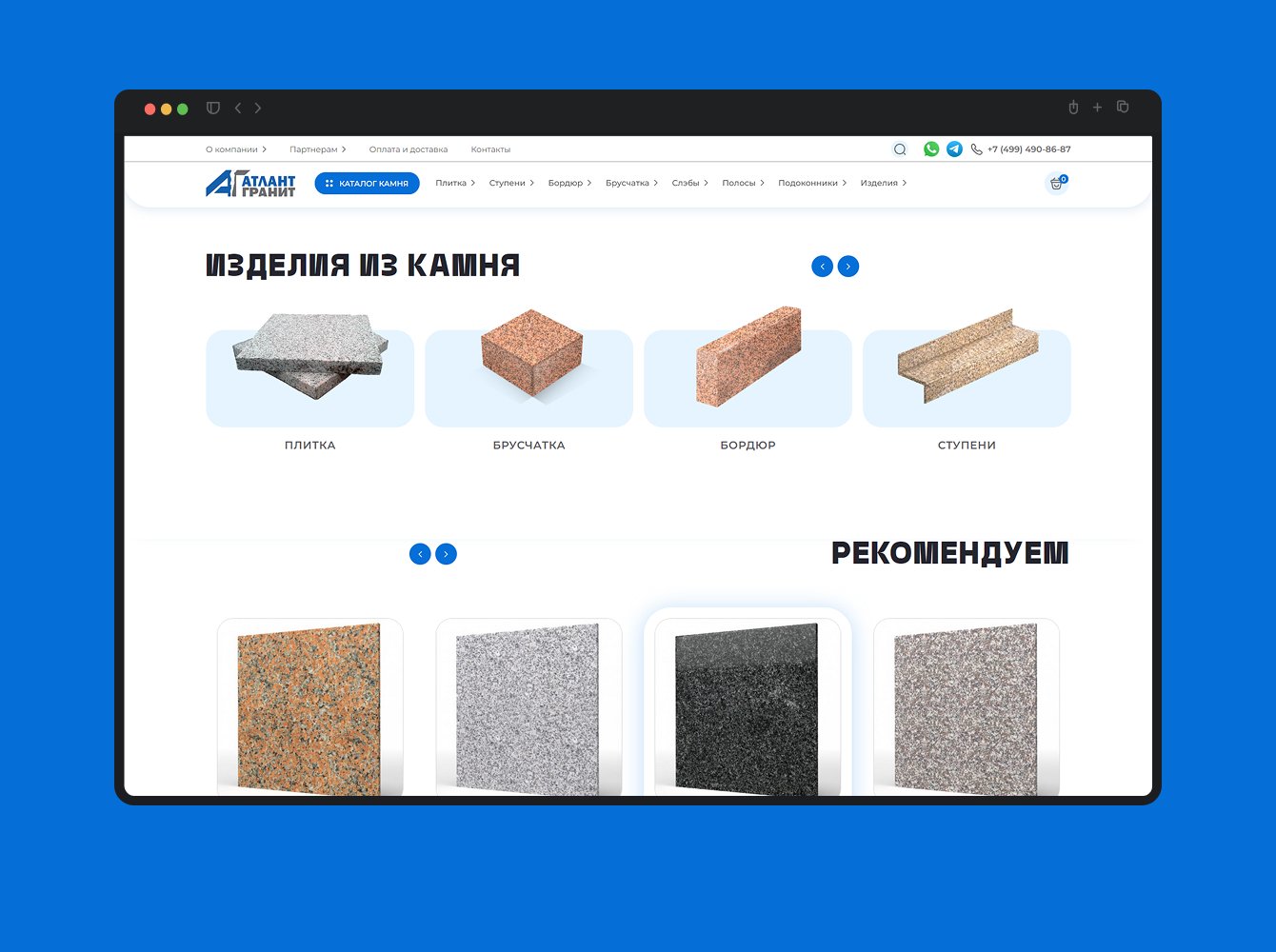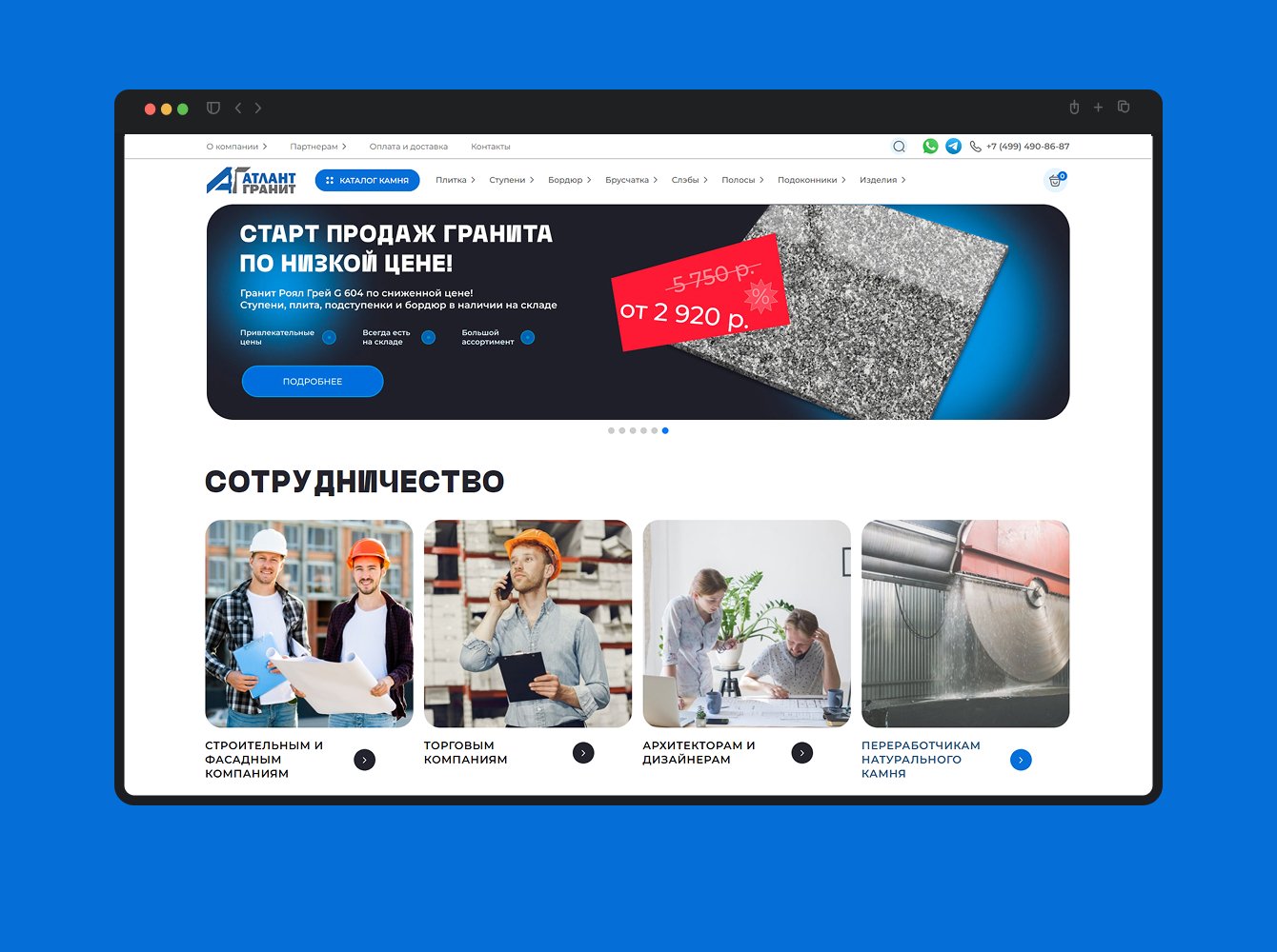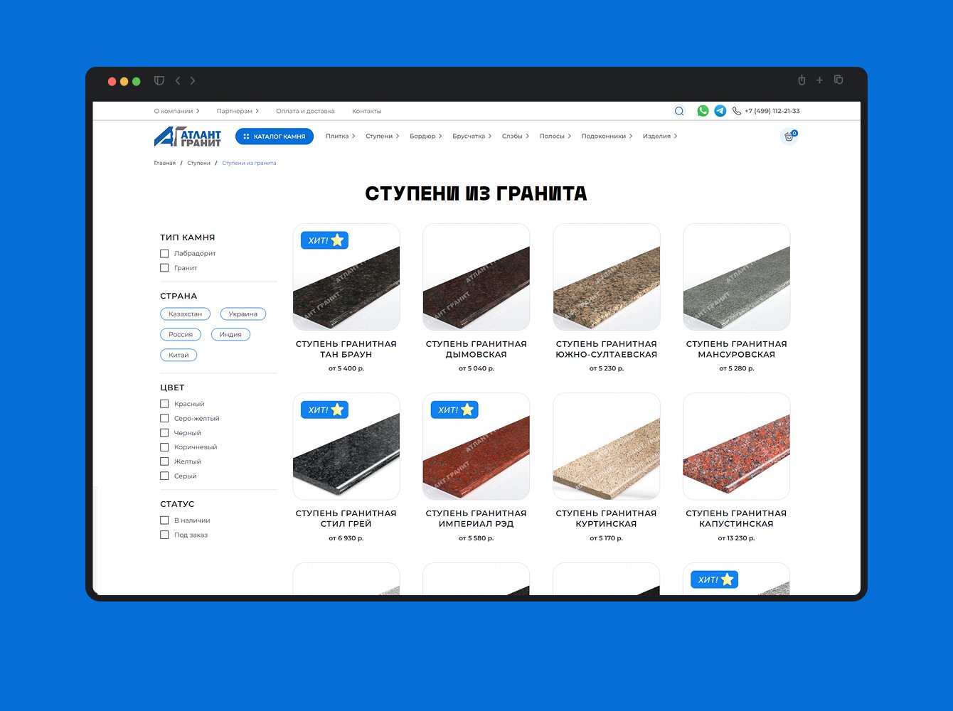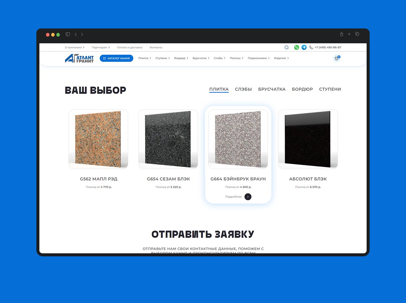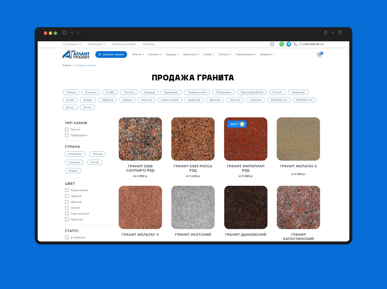 Было необходимо разработать интернет-магазин по продаже изделий из натурального камня — гранита, мрамора, травертина и других. Изделия — плитка, брусчатка, бордюры, слэбы, подоконники, полосы и другие — используемые в строительстве и отделке помещений и фасадов зданий. Так как компания занимается не только продажами, но и оказывает услуги по монтажу и обработке камня, необходимо разработать соответствующие страницы и показать это в товарных карточках.