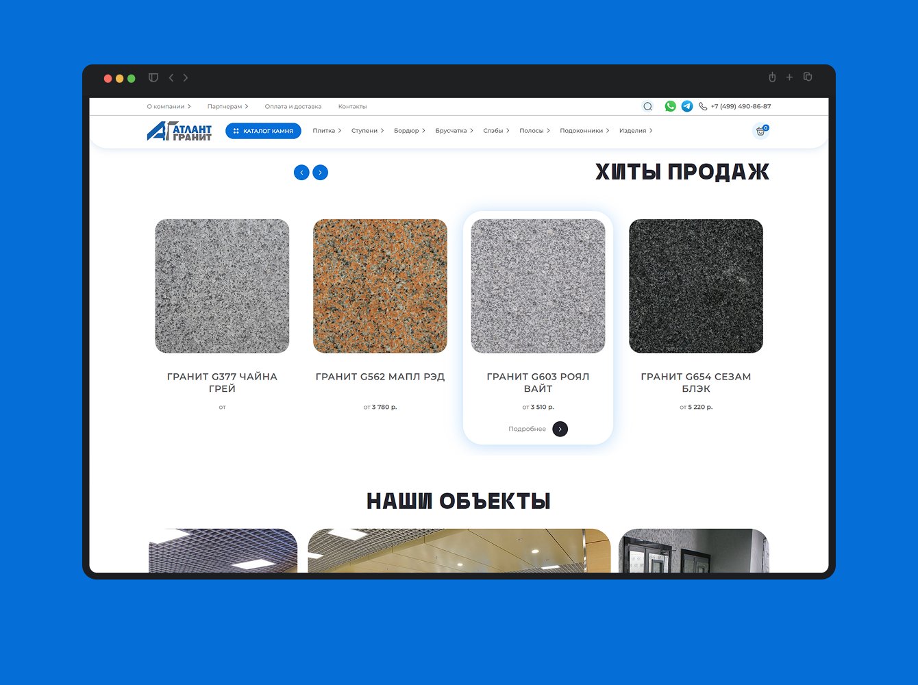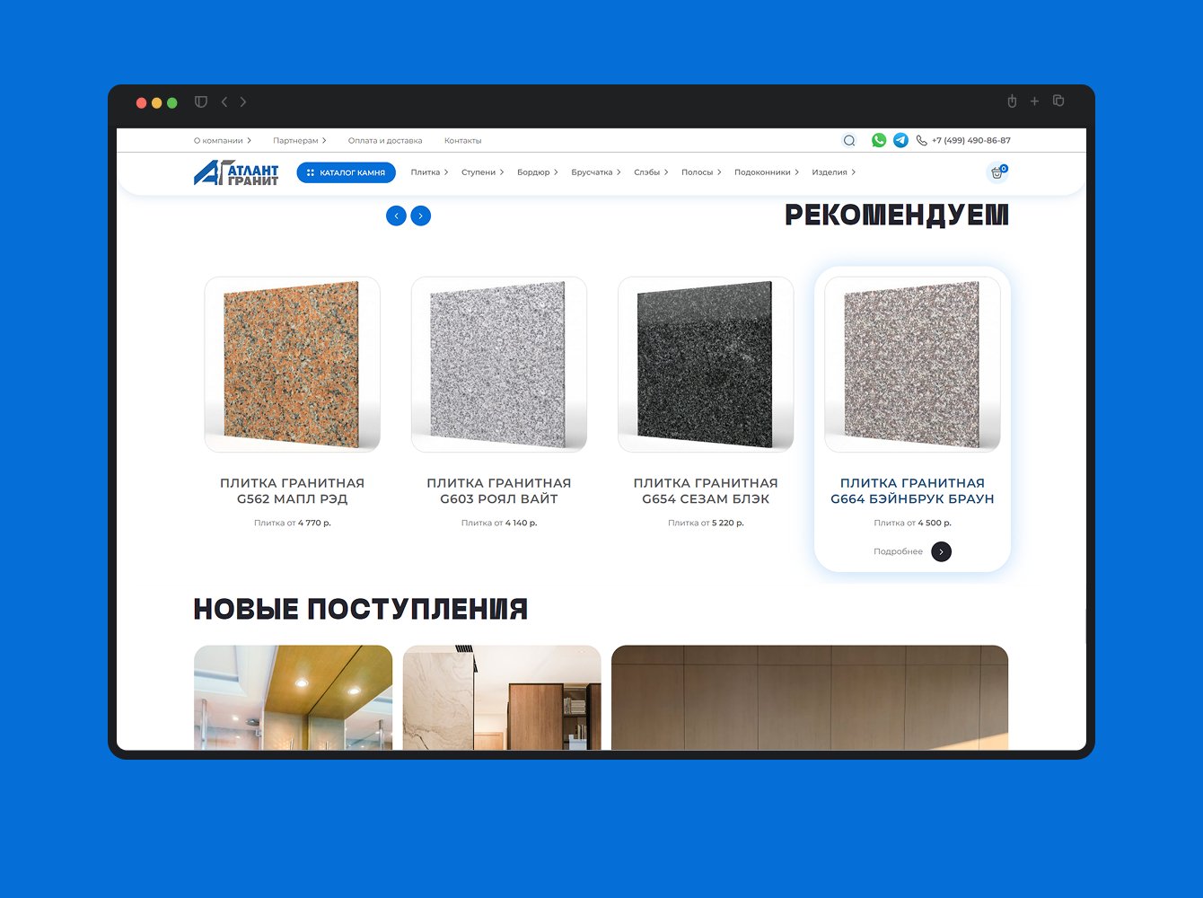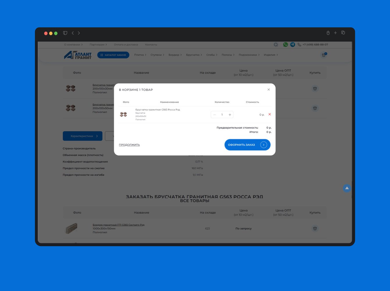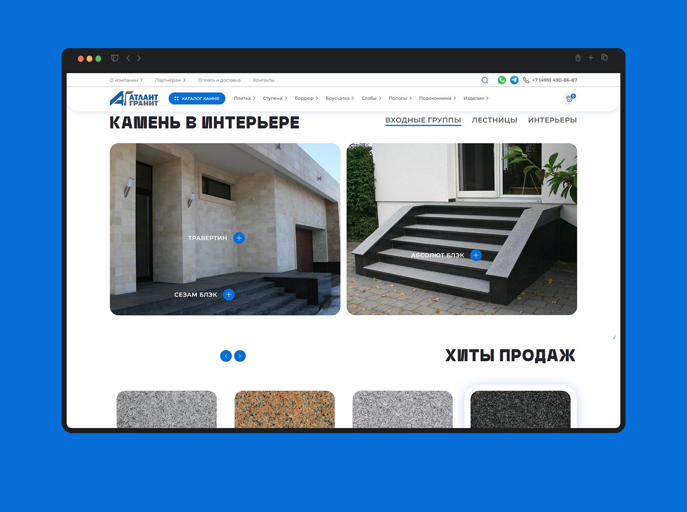 Было необходимо разработать интернет-магазин по продаже изделий из натурального камня — гранита, мрамора, травертина и других. Изделия — плитка, брусчатка, бордюры, слэбы, подоконники, полосы и другие — используемые в строительстве и отделке помещений и фасадов зданий. Так как компания занимается не только продажами, но и оказывает услуги по монтажу и обработке камня, необходимо разработать соответствующие страницы и показать это в товарных карточках.
