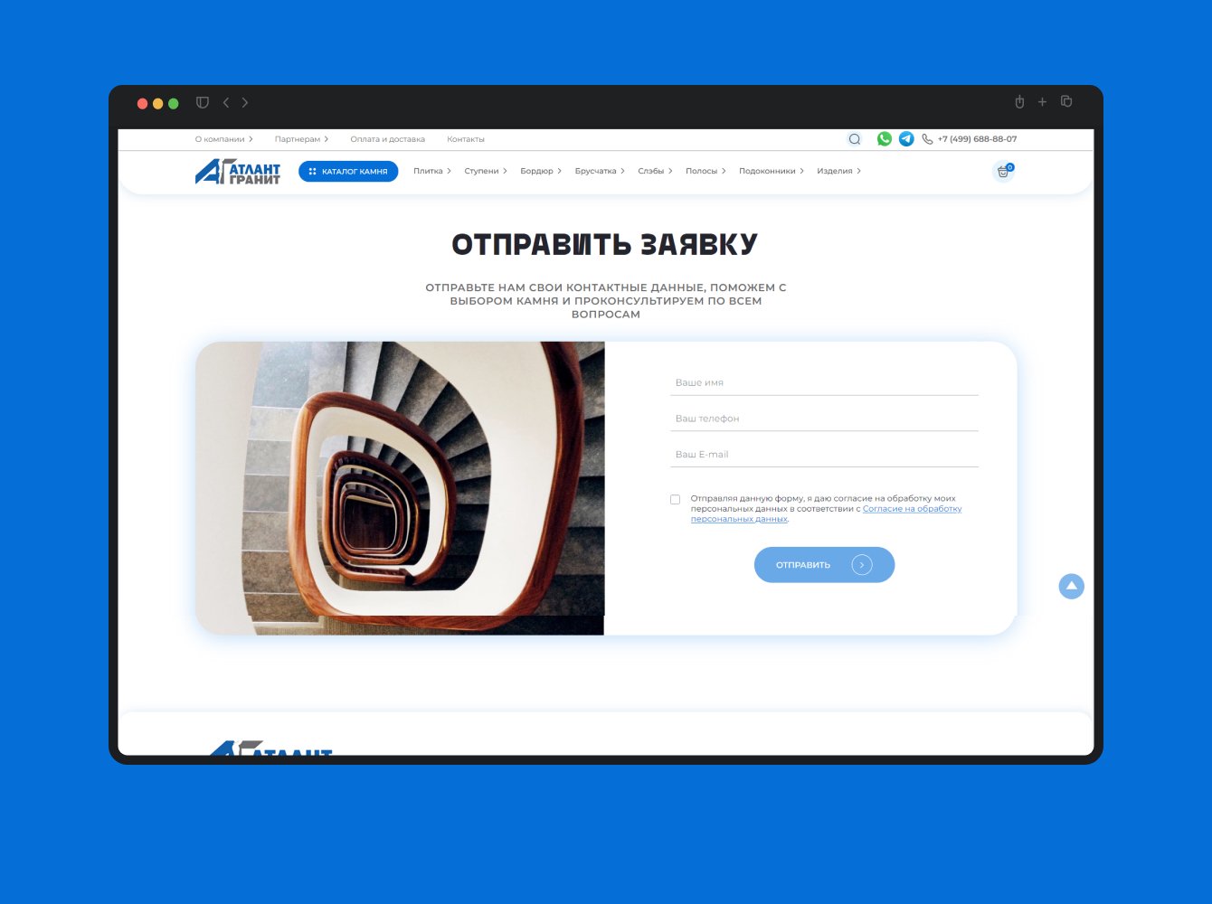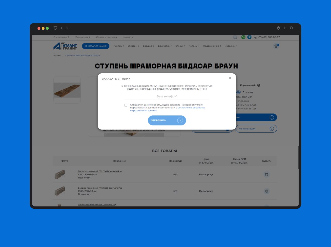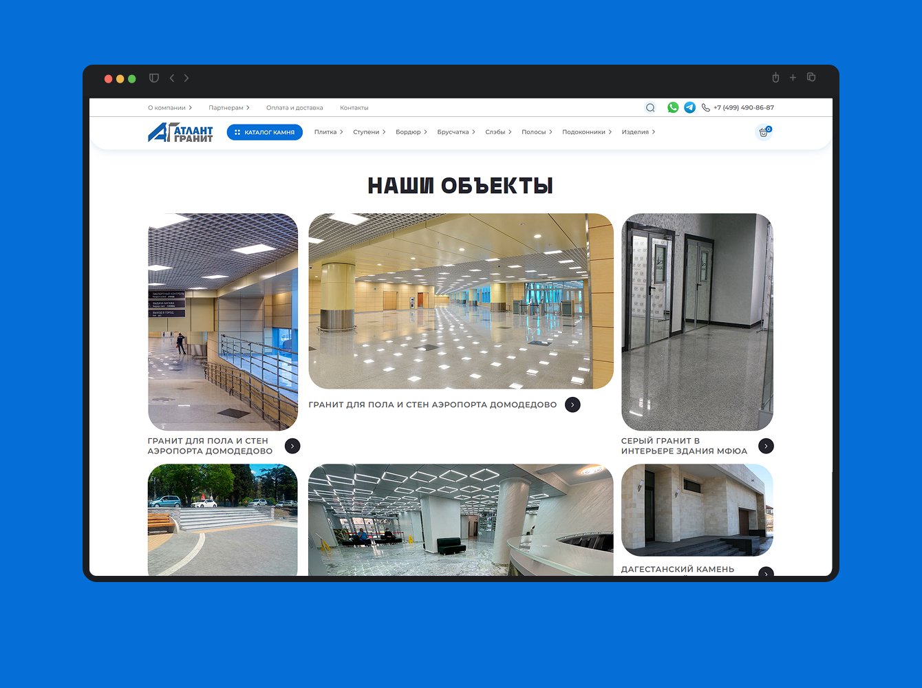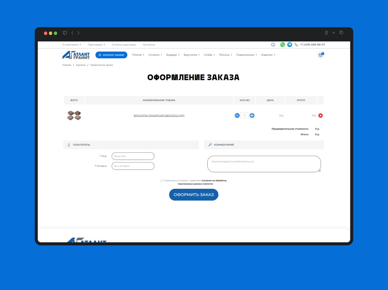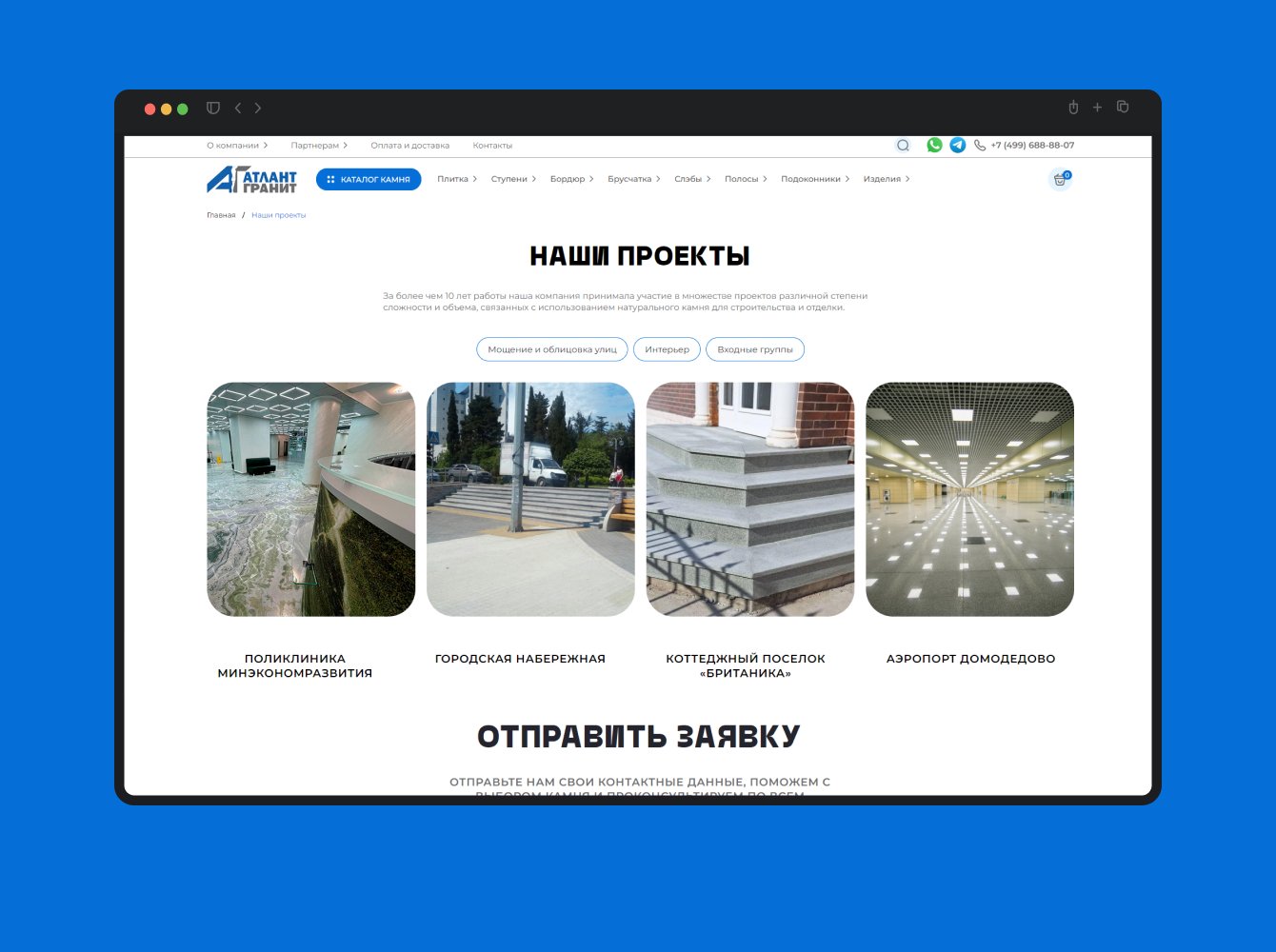 Было необходимо разработать интернет-магазин по продаже изделий из натурального камня — гранита, мрамора, травертина и других. Изделия — плитка, брусчатка, бордюры, слэбы, подоконники, полосы и другие — используемые в строительстве и отделке помещений и фасадов зданий. Так как компания занимается не только продажами, но и оказывает услуги по монтажу и обработке камня, необходимо разработать соответствующие страницы и показать это в товарных карточках.