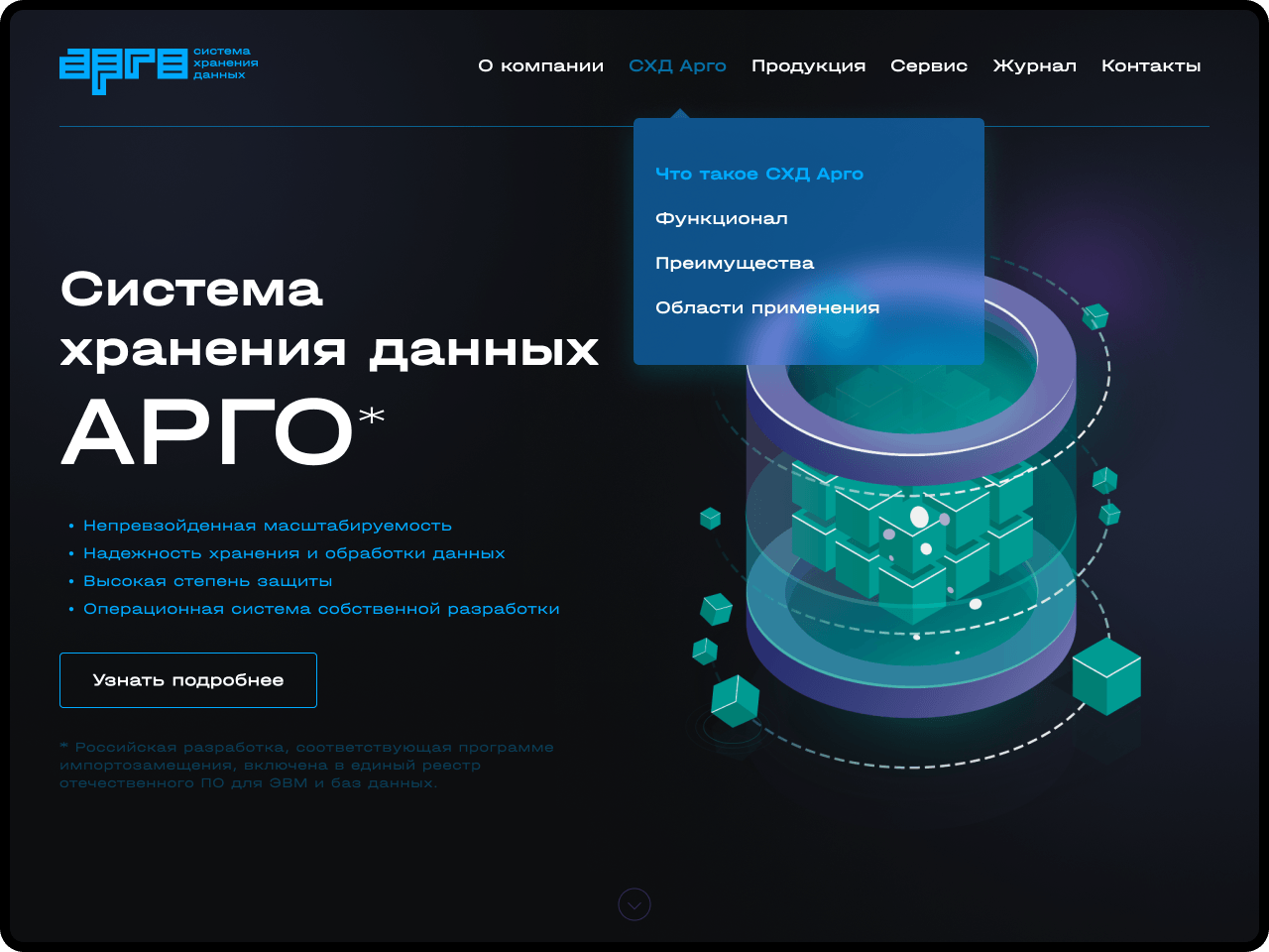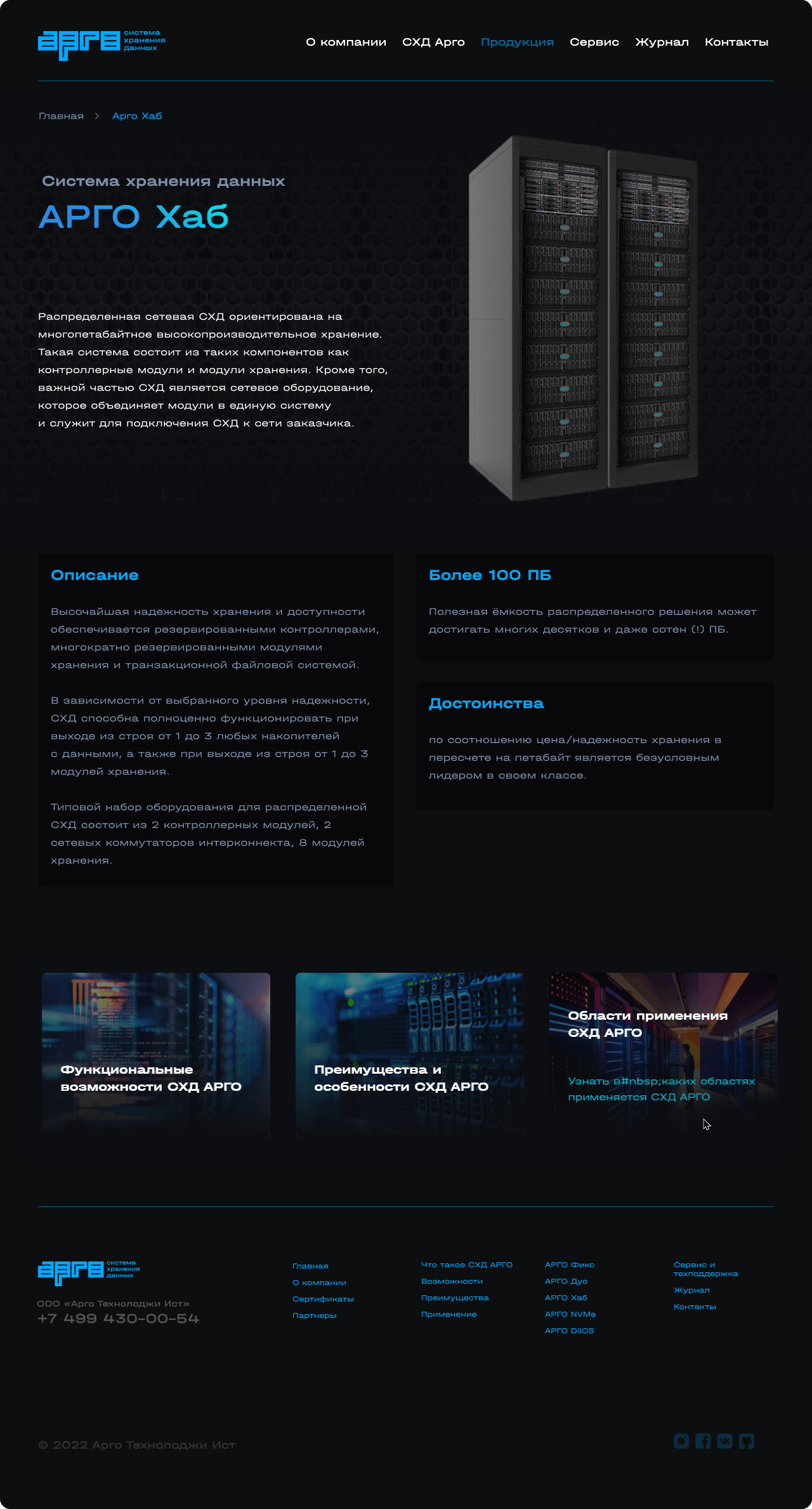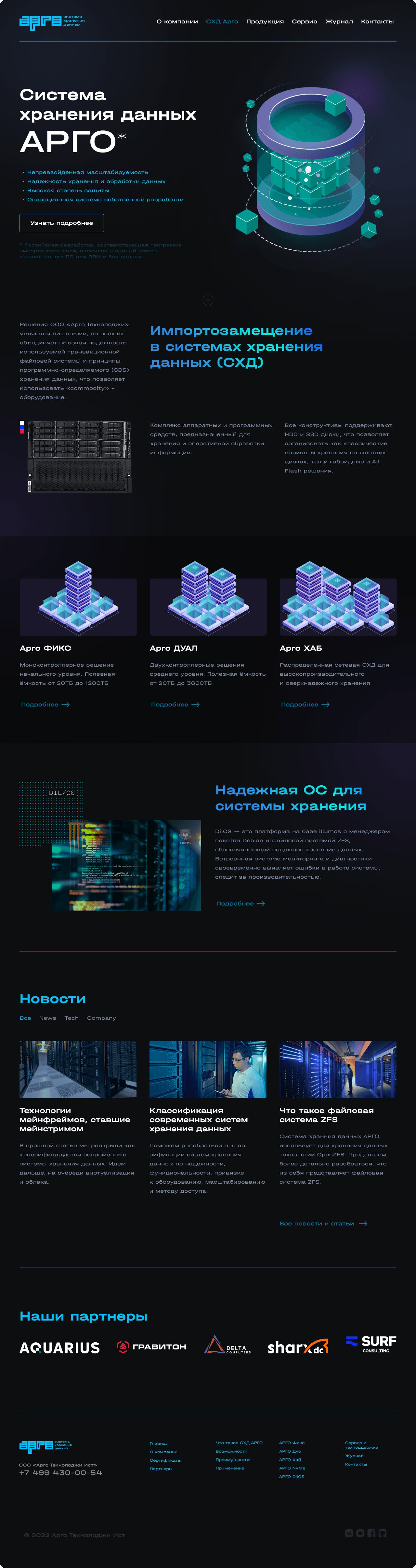 На основе фирменного стиля, описанного в брендбуке, разработать адаптивный сайт для знакомства потенциальных заказчиков и инвесторов с линейкой продуктов СХД АРГО их назначением, функциональными возможностями и преимуществами.