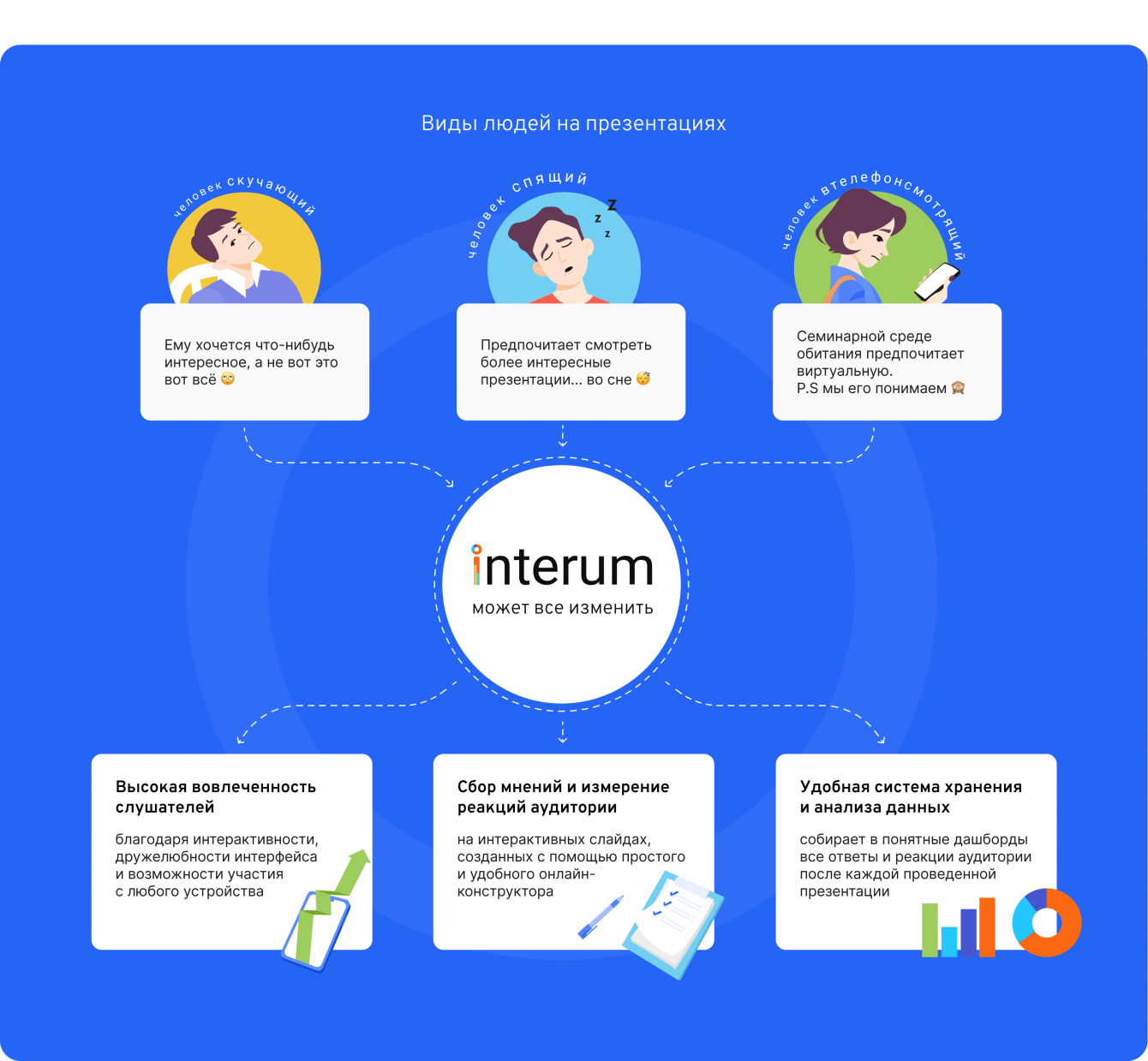 Interum — это система, существенно облегчающая взаимодействие спикера с аудиторией. В распоряжении пользователя — удобный конструктор презентаций, содержащий различные типы интерактивных опросов, с которыми зритель может взаимодействовать в режиме реального времени.