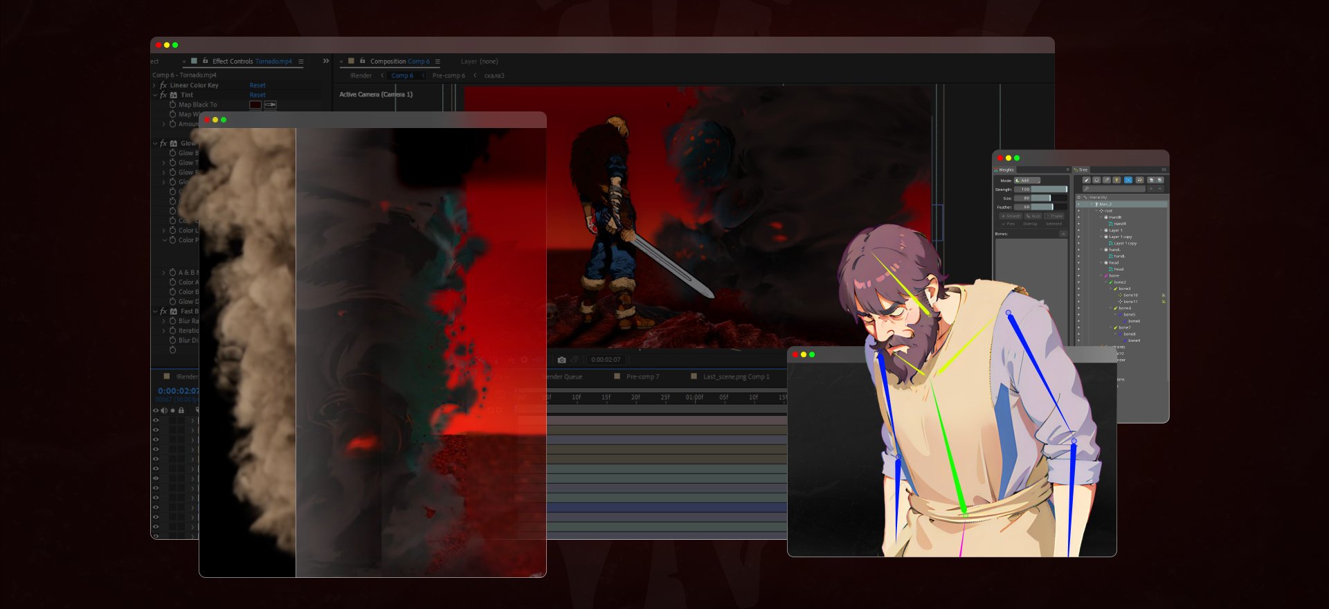 Для анимации 2D-персонажей использовали Spine, Duik. Для некоторых сцен использовали Cinema 4D. Торнадо, например, был собран в Embergen, затем стилизован в ComfyUI в рабочем пространстве "Vid2Vid" с использованием модели Animagine. Эта же модель использовалась для стилизации всего окружения ролика. Также добавили «комиксности» (линии/точки) при помощи масок глубины для всего готового ролика.